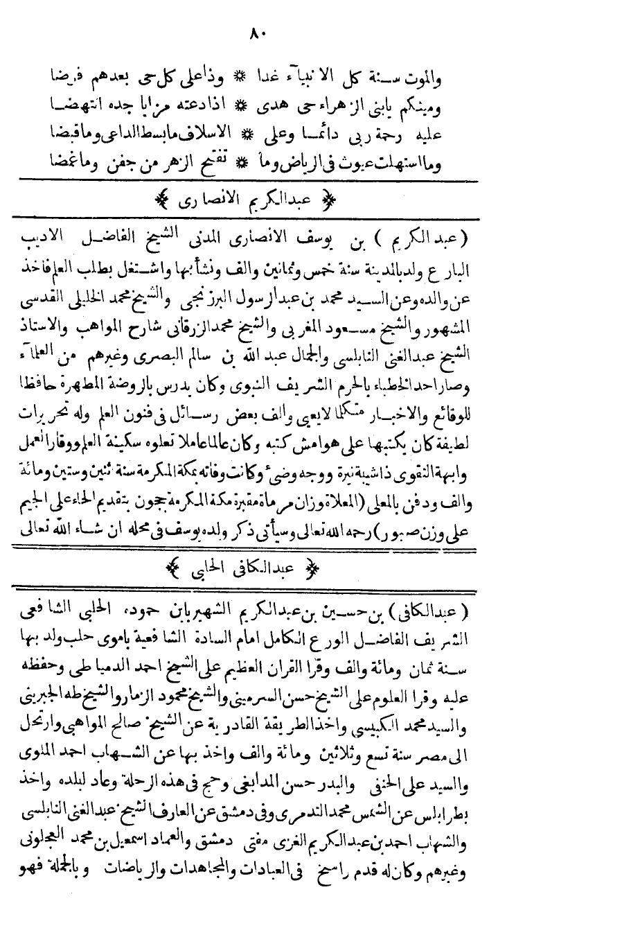 عبد الكريم بن يوسف الأنصاري المدني الشيخ الفاضل الأديب البارع ولد بالمدينة سنة خمس وثمانين وألف ونشأ بها واشتغل بطلب العلم فأخذ عن والده وعن السيد محمد بن عبد الرسول البرزنجي والشيخ محمد الخليلي القدسي المشهور والشيخ مسعود المغربي والشيخ محمد الزرقاني شارح المواهب والأستاذ الشيخ عبد الغني النابلسي والجمال عبد الله بن سالم البصري وغيرهم من العلماء وصار أحد الخطباء بالحرم الشريف النبوي وكان يدرس بالروضة المطهرة حافظاً للوقائع والأخبار متكلماً لا يعيي وألف بعض رسائل في فنون العلم وله تحريرات لطيفة كان يكتبها على هوامش كتبه وكان عالماً عاملاً تعلوه سكينة العلم ووقار العمل وأبهة التقوى ذا شيبة نيرة ووجه وضئ وكانت وفاته بمكة المكرمة سنة اثنين وستين ومائة وألف ودفن بالمعلى المعلاة وزان مرماة مقبرة مكة المكرمة حجون بتقديم الحاء على الجيم على وزن صبور رحمه الله تعالى وسيأتي ذكر ولده يوسف في محله إن شاء الله تعالى.