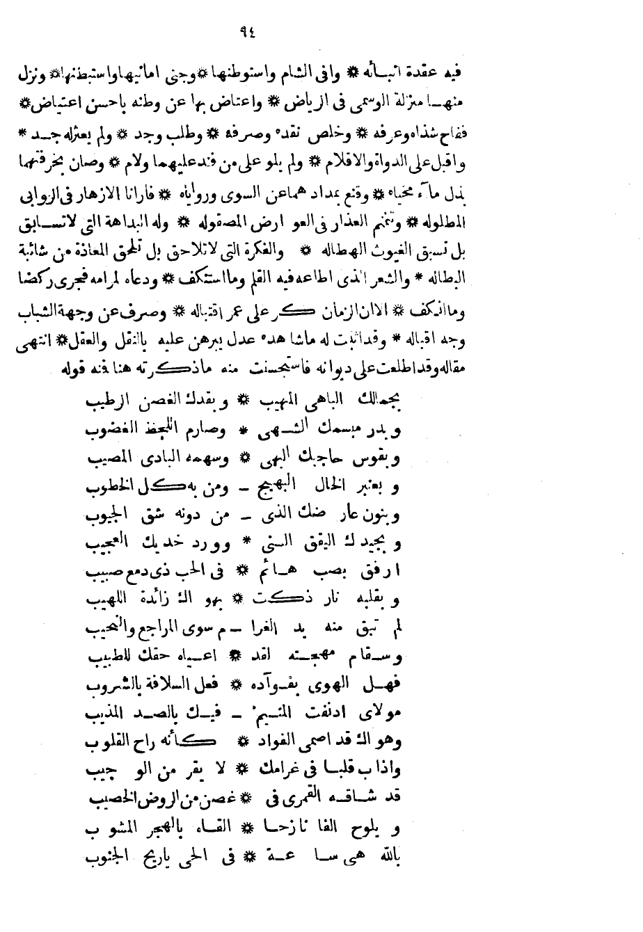 فيه عقدة أنبائه وافى الشام واستوطنها وجنى أمانيها واستبطنها ونزل منها منزلة الوسمى في الرياض واعتاض بها عن وطنه بأحسن اعتياض ففاح شذاه وعرفه وخلص نقده وصرفه وطلب وجد ولم يعثر له جد وأقبل على الدواة والأقلام ولم يلو على من فند عليهما ولام وصان بحرفتهما بذل ماء محياه وقنع بمدادهما عن السوي ورواياه فأرانا الأزهار في الروابي المطلولة وتنمنم العذار في العوارض المصقولة وله البداهة التي لا تسابق بل تسبق الغيوث الهطالة والفكرة التي لا تلاحق بل تلحق المعاذة من شائبة البطالة والشعر الذي أطاعه فيه القلم وما استنكف ودعاه لمرامه فجرى ركضاً وما انكف إلا أن الزمان كر على عمر اقتباله وصرف عن وجهة الشباب وجه اقباله وقد أثبت له ما شاهده عدل يبرهن عليه بالنقل والعقل انتهى مقاله وقد أطلعت على ديوانه فاستحسنت مه ما ذكرته هنا فمنه قوله