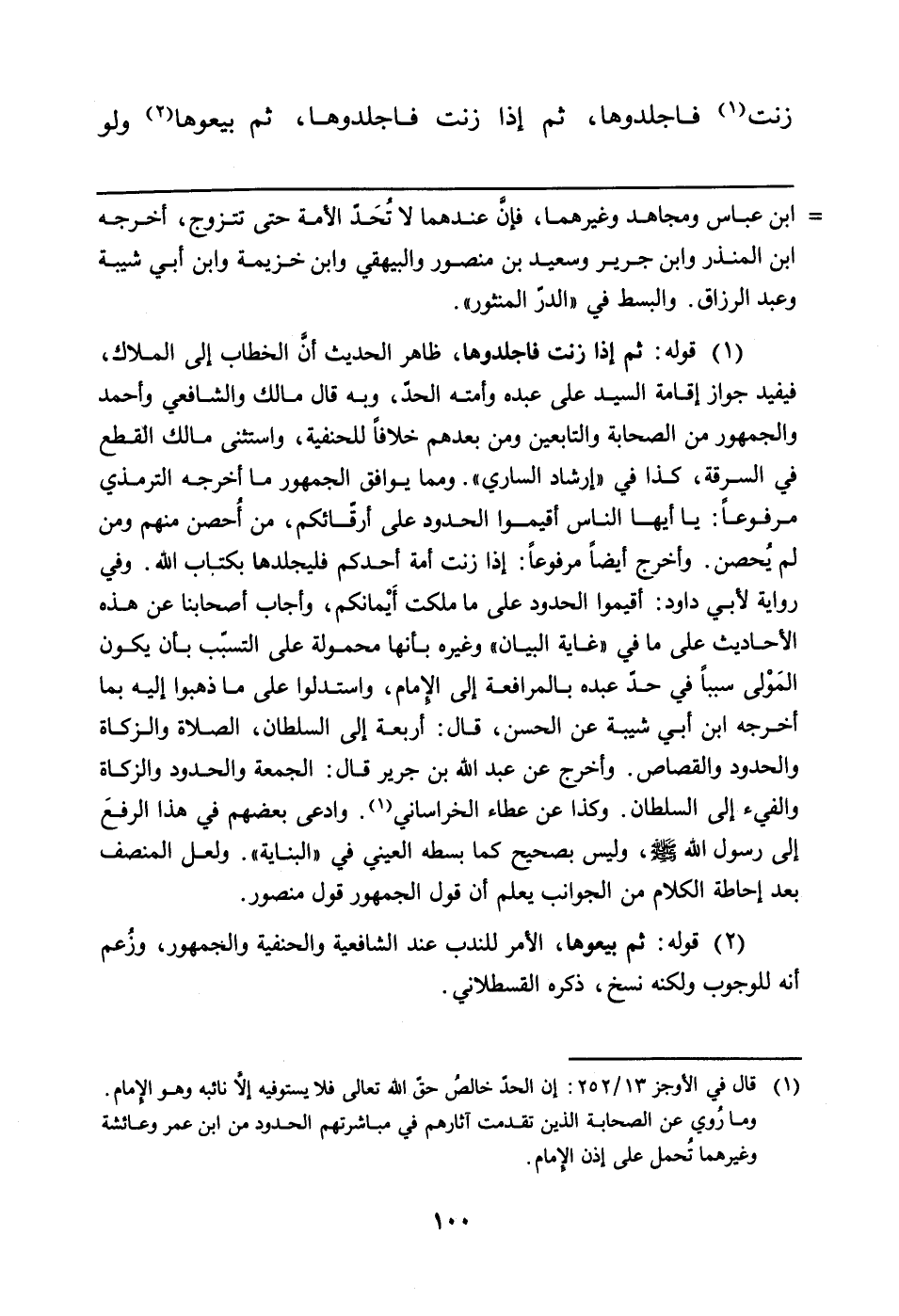 (¬4) قوله: ثم إذا زنت فاجلدوها، ظاهر الحديث أنَّ الخطاب إلى الملاك، فيفيد جواز إقامة السيد على عبده وأمته الحدّ، وبه قال مالك والشافعي وأحمد والجمهور من الصحابة والتابعين ومن بعدهم خلافاً للحنفية، واستثنى مالك القطع في السرقة، كذا في "إرشاد الساري". ومما يوافق الجمهور ما أخرجه الترمذي مرفوعاً: يا أيها الناس أقيموا الحدود على أرقّائكم، من أُحصن منهم ومن لم يُحصن. وأخرج أيضاً مرفوعاً: إذا زنت أمة أحدكم فليجلدها بكتاب الله. وفي رواية لأبي داود: أقيموا الحدود على ما ملكت أَيْمانكم، وأجاب أصحابنا عن هذه الأحاديث على ما في "غاية البيان" وغيره بأنها محمولة على التسبّب بأن يكون المَوْلى سبباً في حدّ عبده بالمرافعة إلى الإِمام، واستدلوا على ما ذهبوا إليه بما أخرجه ابن أبي شيبة عن الحسن، قال: أربعة إلى السلطان، الصلاة والزكاة والحدود والقصاص. وأخرج عن عبد الله بن جرير قال: الجمعة والحدود والزكاة والفيء إلى السلطان. وكذا عن عطاء الخرساني (قال في الأوجز 13/252: إن الحدّ خالصُ حقّ الله تعالى فلا يستوفيه إلاَّ نائبه وهو الإِمام. وما رُوي عن الصحابة الذين تقدمت آثارهم في مباشرتهم الحدود من ابن عمر وعائشة وغيرهما تُحمل على إذن الإِمام) . وادعى بعضهم في هذا الرفعَ إلى رسول الله صلى الله عليه وسلم، وليس بصحيح كما بسطه العيني في "البناية". ولعل المنصف بعد إحاطة الكلام من الجوانب يعلم أن قول الجمهور قول المنصور.