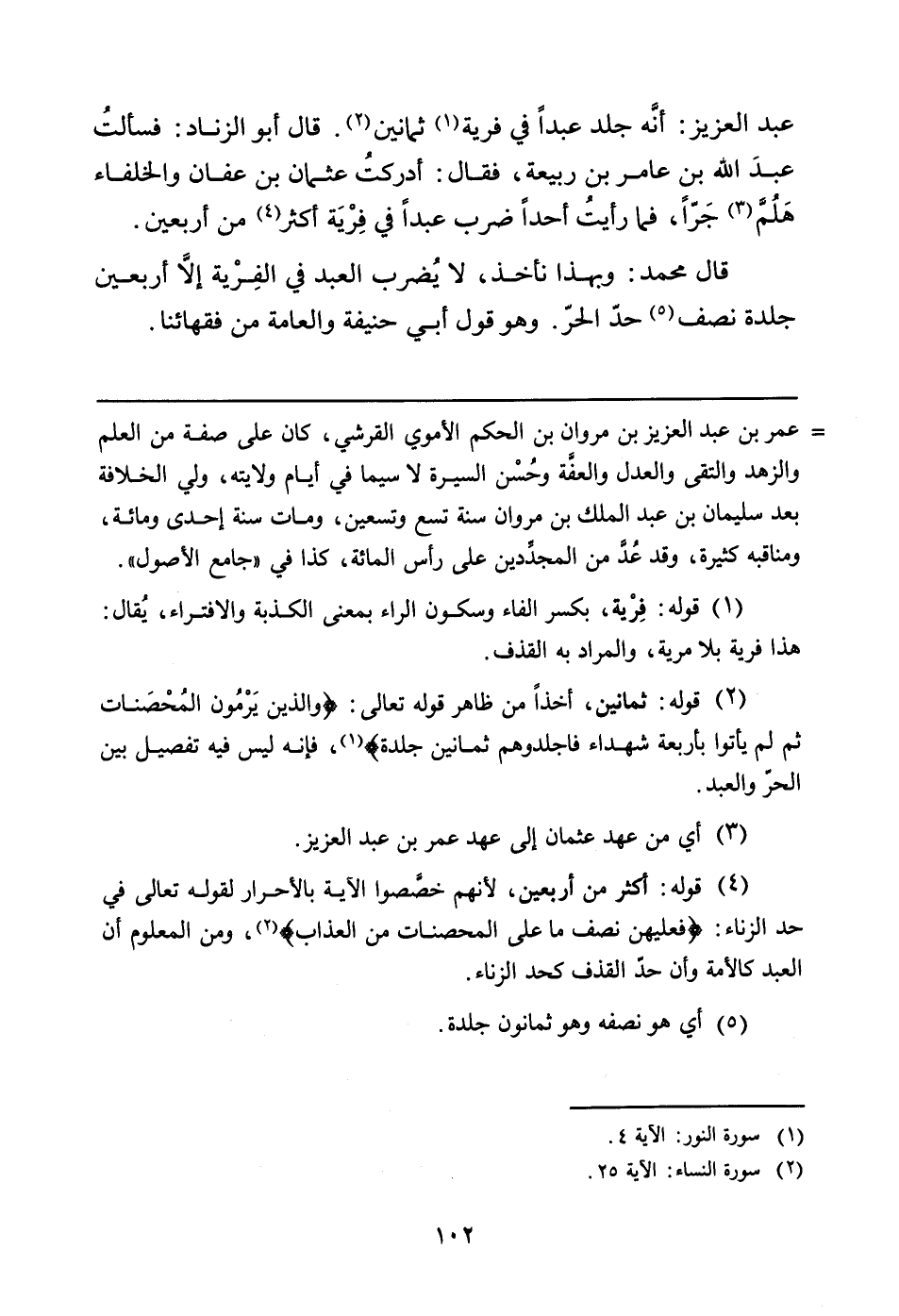 عَبْدِ الْعَزِيزِ: أنَّه جَلَدَ عَبْدًا فِي فِرْيَةٍ (¬1) ثمانين (¬2) . قال أبو زناد: فسألتُ عبدَ اللَّهِ بْنَ عَامِرِ بْنِ رَبِيعَةَ، فَقَالَ: أدركتُ عُثْمَانَ بْنَ عَفَّانَ وَالْخُلَفَاءَ هَلُمْ (¬3) جَرّاً، فَمَا رَأَيْتُ أَحَدًا ضَرَبَ عَبْدًا فِي فِرْيَة أكثر (¬4) من أربعين.