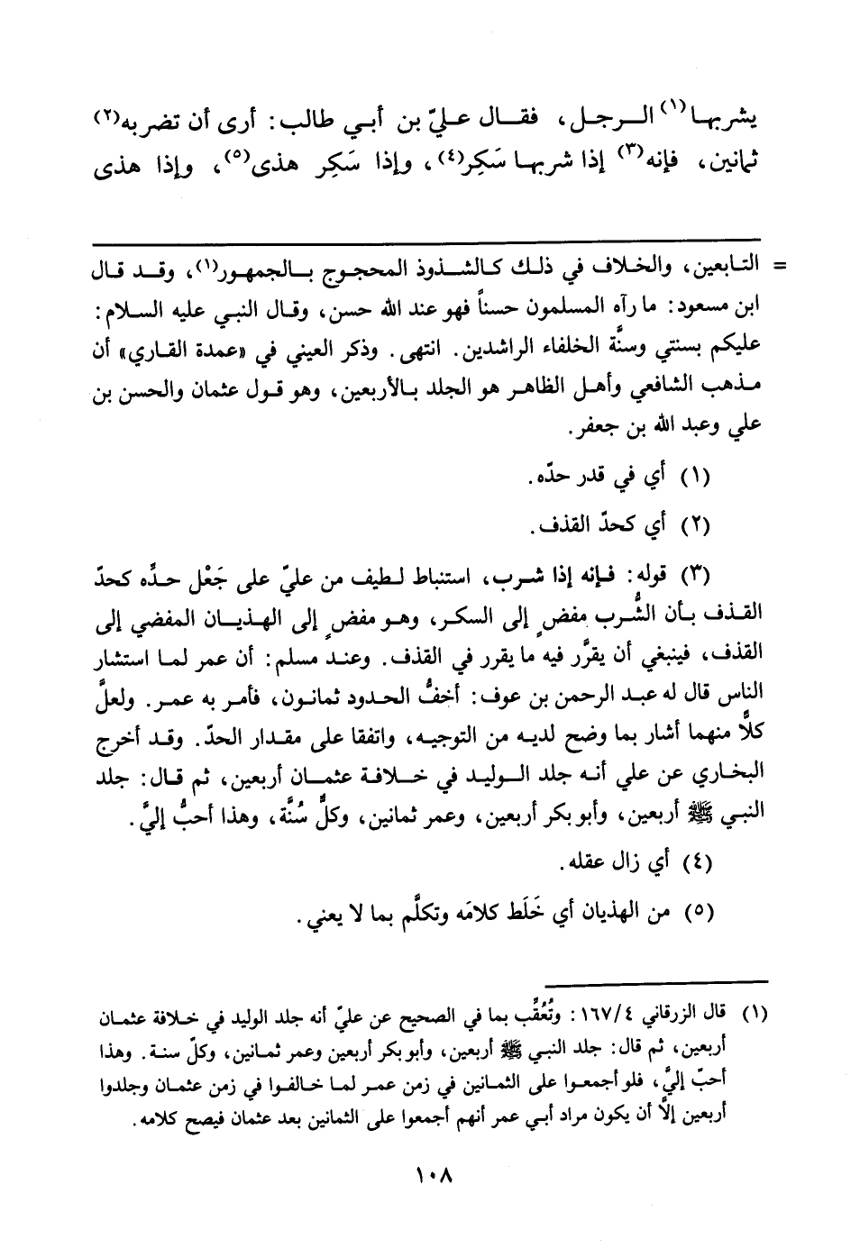 التابعين، والخلاف في ذلك كالشذوذ المحجوج بالجمهور (قال الزرقاني 4/167: وتُعُقِّب بما في الصحيح عن عليّ أنه جلد الوليد في خلافة عثمان أربعين، ثم قال: جلد النبي صلى الله عليه وسلم أربعين، وأبو بكر أربعين، وأبو بكر أربعين وعمر ثمانين، وكلّ سنة. وهذا أحبّ إليَّ، فلو أجمعوا على الثمانين في عمر لما خالفوا في زمن عثمان وجلدوا أربعين إلاَّ أن يكون مراد أبي عمر أنهم أجمعوا على الثمانين بعد عثمان فيصح كلامه) ، وقد قال ابن مسعود: ما رآه المسلمون حسناً فهو عند الله حسن، وقال النبي عليه السلام: عليكم بسنتي وسنَّة الخلفاء الراشدين. انتهى. وذكر العيني في "عمدة القاري" أن مذهب الشافعي وأهل الظاهر هو الجلد أربعين، وهو قول عثمان والحسن بن علي وعبد الله بن جعفر.