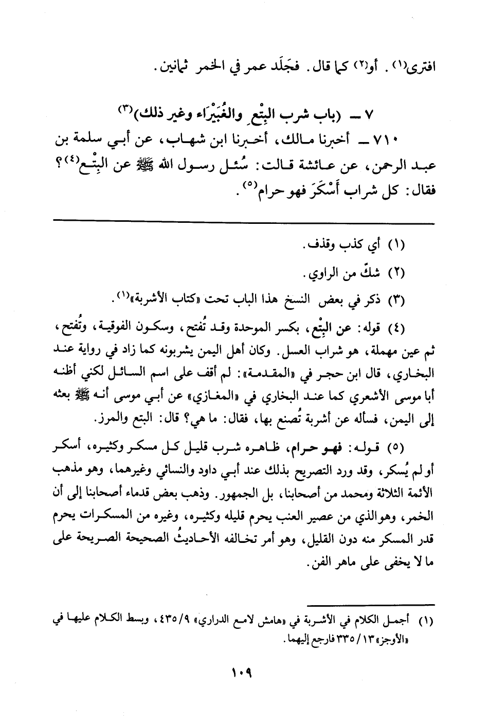 710 - أَخْبَرَنَا مَالِكٌ، أَخْبَرَنَا ابْنُ شِهَابٍ، عَنْ أَبِي سَلَمَةَ بْنِ عَبْدِ الرَّحْمَنِ، عَنْ عَائِشَةَ قَالَتْ: سُئل رَسُولُ اللَّهِ صَلَّى اللَّهُ عَلَيْهِ وَسَلَّمَ عَنِ البِتْع (¬4) ؟ فَقَالَ: كُلُّ شَرَابٍ أَسْكَرَ فهو حرام (¬5) .