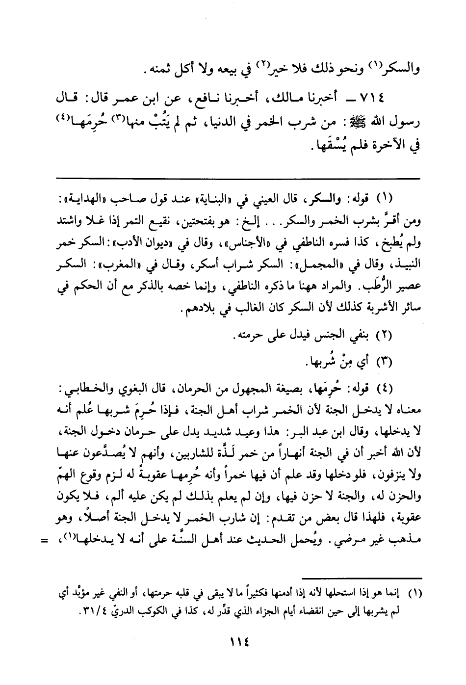 714 - أَخْبَرَنَا مَالِكٌ، أَخْبَرَنَا نَافِعٌ، عَنِ ابْنِ عُمَرَ قَالَ: قَالَ رَسُولُ اللَّهِ صَلَّى اللَّهُ عَلَيْهِ وَسَلَّمَ: مَنْ شَرِبَ الْخَمْرَ فِي الدُّنْيَا، ثُمَّ لَمْ يَتُبْ مِنْهَا (¬3) حُرِمَها (¬4) فِي الآخِرَةِ فَلَمْ يُسْقَها.