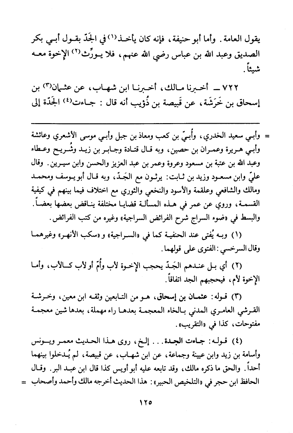 722 - أَخْبَرَنَا مَالِكٌ، أَخْبَرَنَا ابْنُ شِهَابٍ، عَنْ عُثْمَانَ (¬3) بْنِ إِسْحَاقَ بْنِ خَرَشَة، عَنْ قَبِيصَةَ بْنِ ذُؤيب أَنَّهُ قال: جاءت (¬4) الجَدّة إلى