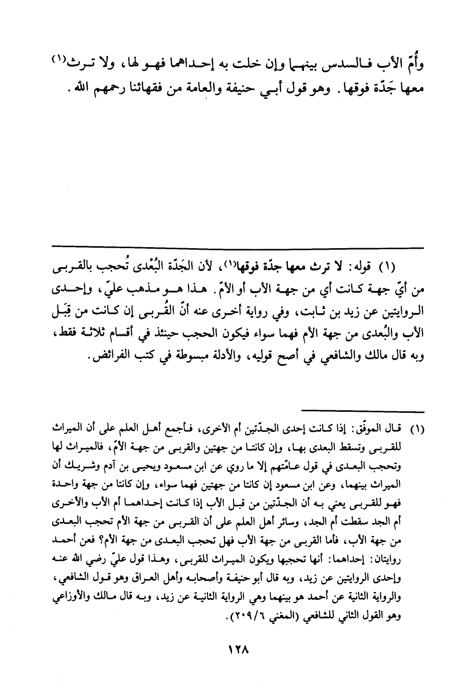 (¬1) قوله: لا ترث معها جدّة فوقها (قال الموفّق: إذا كانت إحدى الجدّتين أم الأخرى، فأجمع أهل العلم على أن الميراث للقربى وتسقط البعدى بها، وإن كانتا من جهتين والقربى من جهة الأمّ، فالميراث لها وتحجب البعدى في قول عامّتهم إلا ما روي عن ابن مسعود ويحيى بن آدم وشريك أن الميراث بينهما، وعن ابن مسعود إن كانتا من جهتين فهما سواء، وإن كانتا من جهة واحدة فهو للقربى يعني به أن الجدّتين من قبل الأب إذا كانت إحداهما أم الأب والأخرى أم الجد سقطت أم الجد، وسائر أهل العلم على أن القربى من جهة الأم تحجب البعدى من جهة الأب، فأما القربى من جهة الأب فهل تحجب البعدى من جهة الأم؟ فعن أحمد رويتان: إحداهما: أنها تحجبها ويكون الميراث للقربى، وهذا قول عليّ رضي الله عنه وإحدى الروايتين عن زيد، وبه قال أبو حنيفة وأصحابه وأهل العراق وهو قول الشافعي، والرواية الثانية عن أحمد هو بينهما وهي الرواية الثانية عن زيد، وبه قال مالك والأوزعي وهو قول الثاني للشافعي (المغني 6/209) ، لأن الجَدّة البُعْدى تُحجب بالقربى من أيّ جهة كانت أي من جهة الأب أو الأمّ. هذا هو مذهب عليّ، وإحدى الرواتين عن زيد بن ثابت، وفي رواية أخرى عنه أنّ القُربى إن كانت من قِبَل الأب والبُعدى من جهة الأم فهما سواء فيكون الحجب حينئذ في أقسام ثلاثة فقط، وبه قال مالك والشافعي في أصح قوليه، والأدلة مبسوطة في كتب الفرائض.