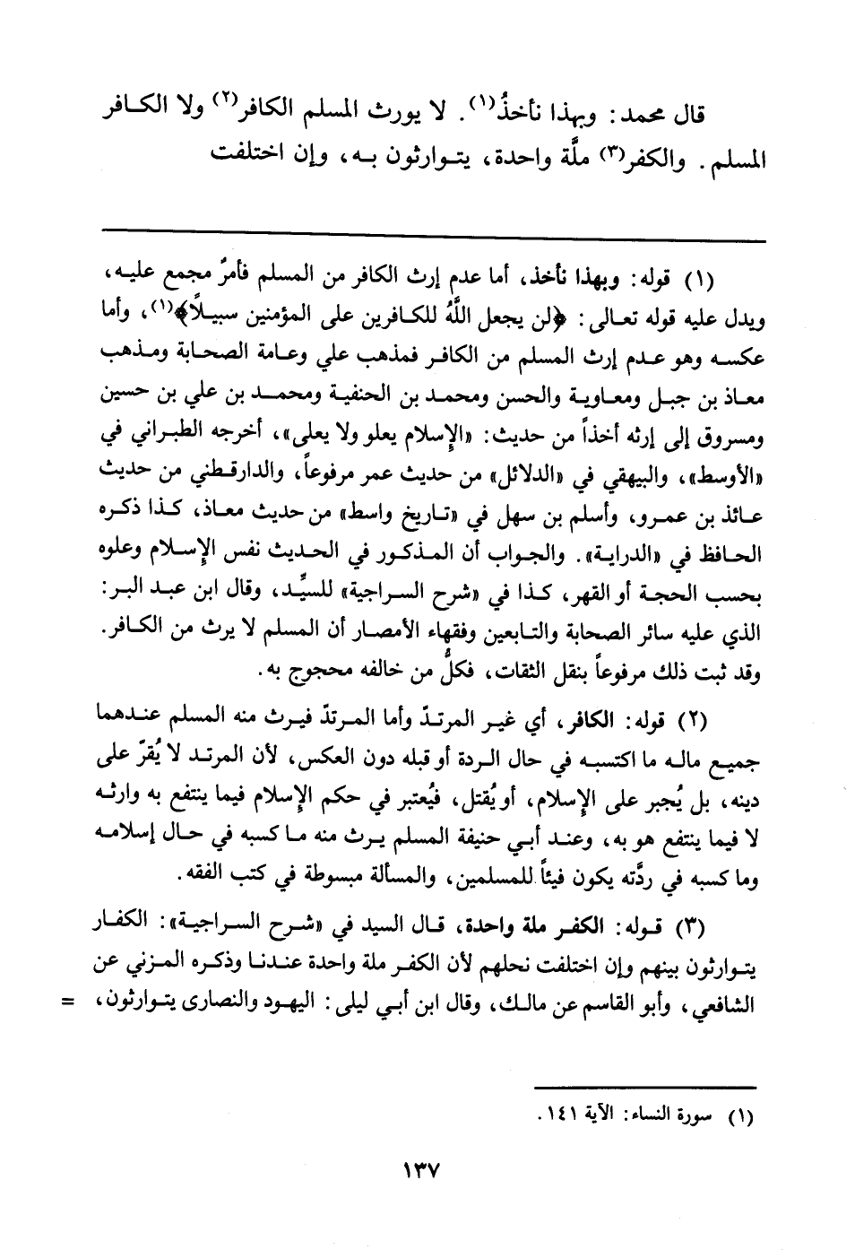 قال محمد: وبهذا نأخذُ (¬1) . لا يورث الْمُسْلِمُ الْكَافِرَ (¬2) وَلا الْكَافِرُ الْمُسْلِمَ. وَالْكُفْرُ (¬3) ملَّة واحدة، يتواثون به، وإن اختلفت