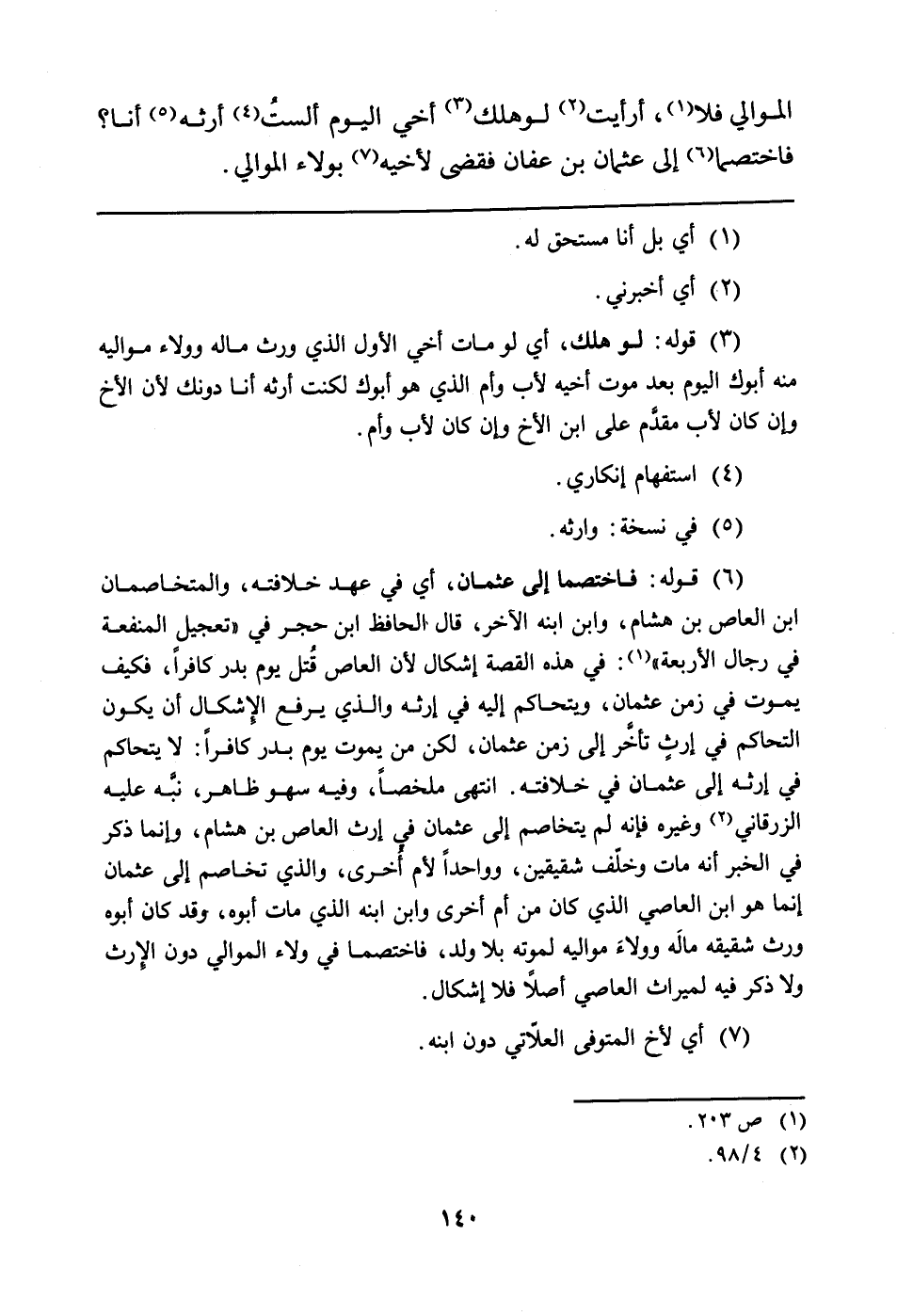 (¬6) قوله: فاختصما إلى عثمان، أي في عهد خلافته، والمتخاصمان ابن العاص بن هشام، وابن ابنه الآخر، قال الحافظ ابن حجر في "تعجيل المنفعة في رجال الأربعة" (ص 203) : في هذه القصة إشكال لأن العاص قُتل يوم بدر كافراً، فكيف يموت في زمن عثمان، ويتحاكم إليه في إرثه والذي يرفع الإِشكال أن يكون التحاكم في إرثٍ تأخَّر إلى زمن عثمان، لكن من يموت يوم بدر كافراً: لا يتحاكم في إرثه إلى عثمان في خلافته. انتهى ملخصاً، وفيه سهو ظاهر، نبَّه عليه الزرقاني (4/98) وغيره فإنه لم يتخاصم إلى عثمان في إرث العاص بن هشام، وإنما ذكر في الخبر أنه مات وخلّف شقيقين، وواحداً لأم أُخرى، والذي تخاصم إلى عثمان إنما هو ابن العاصي الذي كان من أم أخرى وابن ابنه الذي مات أبوه، وقد كان أبوه ورث شقيقه مالَه وولاءَ مواليه لموته بلا ولد، فاختصما في ولاء الموالي دون الإِرث ولا ذكر فيه لميراث العاصي أصلاً فلا إشكال.