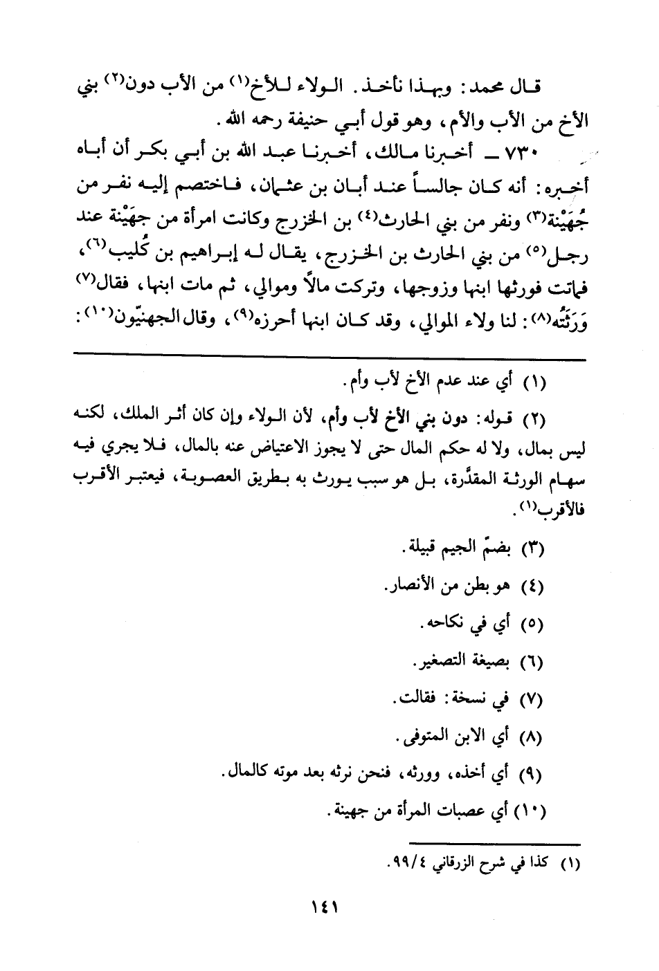 730 - أَخْبَرَنَا مالك، أخبرنا عبد الله بن أبي بكر أَنَّ أَبَاهُ أَخْبَرَهُ: أَنَّهُ كَانَ جَالِسًا عِنْدَ أَبَانِ بْنِ عُثْمَانَ، فَاخْتَصَمَ إِلَيْهِ نَفَرٌ مِنْ جُهَيْنة (¬3) وَنَفَرٌ مِنْ بَنِي الْحَارِثِ (¬4) بْنِ الْخَزْرَجِ وَكَانَتِ امْرَأَةٌ مِنْ جهَيْنة عِنْدَ رَجُلٍ (¬5) مِنْ بَنِي الْحَارِثِ بْنِ الْخَزْرَجِ، يُقَالُ لَهُ إِبْرَاهِيمُ بْنُ كُليب (¬6) ، فَمَاتَتْ فَوَرِثَهَا ابْنُهَا وَزَوْجُهَا، وَتَرَكَتْ مالاً وموالي، ثُمَّ مَاتَ ابْنُهَا، فَقَالَ (¬7) وَرَثَتُه (¬8) : لَنَا وَلَاءُ الْمَوَالِي، وَقَدْ كَانَ ابْنُهَا أَحْرَزَهُ (¬9) ، وَقَالَ الْجُهَنِيُّونَ (¬10) :