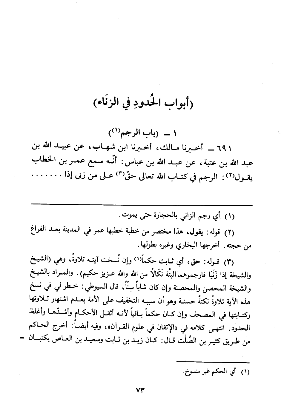 691 - أَخْبَرَنَا مَالِكٌ، أَخْبَرَنَا ابْنُ شِهَابٍ، عَنْ عُبَيْدِ اللَّهِ بْنِ عَبْدِ اللَّهِ بْنِ عُتْبَةَ، عَنْ عَبْدِ اللَّهِ بْنِ عَبَّاسٍ: أَنَّهُ سَمِعَ عُمَرَ بْنَ الْخَطَّابِ يَقُولُ (¬2) : الرَّجْمُ فِي كِتَابِ اللَّهِ تعالى حقّ (¬3) على من زنى إذا