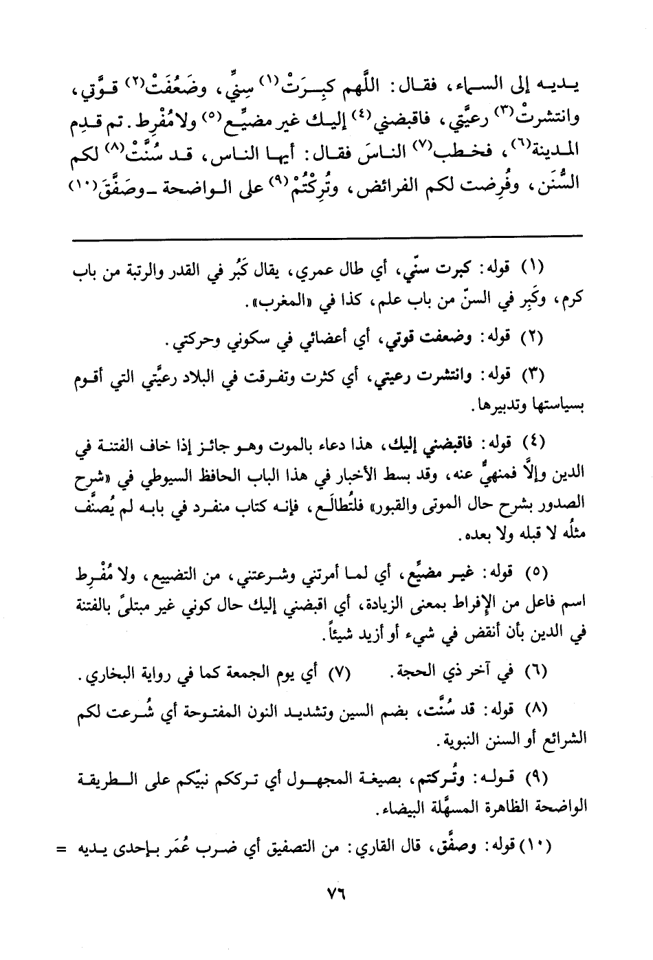 يَدَيْهِ إِلَى السَّمَاءِ، فَقَالَ: اللَّهُمَّ كبِرَتْ (¬1) سِنِّي، وضَعُفَتْ (¬2) قوَّتي، وانتشرتْ (¬3) رعيَّتي، فَاقْبِضْنِي (¬4) إِلَيْكَ غَيْرَ مضيِّع (¬5) وَلا مُفْرِط. ثُمَّ قدِم الْمَدِينَةَ (¬6) ، فَخَطَبَ (¬7) الناسَ فَقَالَ: أَيُّهَا النَّاسُ، قَدْ سُنَّتْ (¬8) لَكُمُ السُّنَن، وفُرِضت لَكُمُ الْفَرَائِضُ، وتُرِكْتُمْ (¬9) عَلَى الْوَاضِحَةِ - وصَفَّقَ (¬10)