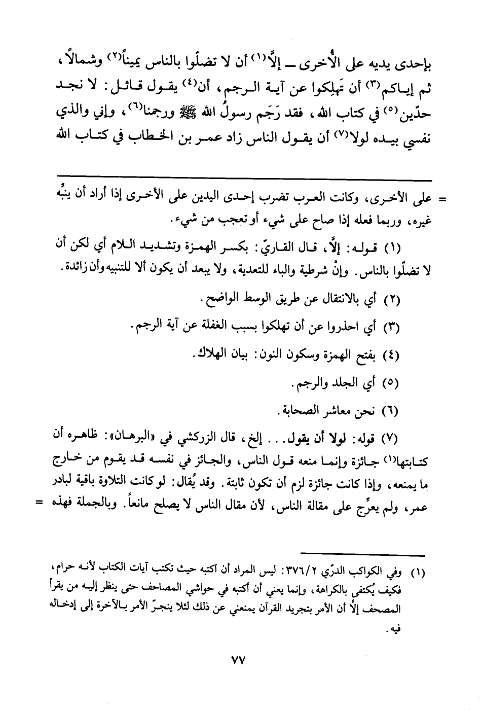 (¬7) قوله: لولا أن يقول ... إلخ، قال الزركشي في "البرهان": ظاهره أن كتابتها (وفي الكواكب الدرّي 2/376: ليس المراد أن اكتبه حيث تكتب آيات الكتاب لأنه حرام، فكيف يُكتفى بالكراهة، وإنما يعني أن أكتبه في حواشي المصاحف حتى ينظر إليه من يقرأ المصحف إلاَّ أن الأمر بتجريد القرآن يمنعني عن ذلك لئلا ينجرّ الأمر بالآخرة إلى إدخاله فيه) جائزة وإنما منعه قول الناس، والجائز في نفسه قد يقوم من خارج ما يمنعه، وإذا كانت جائزة لزم أن تكون ثابتة. وقد يُقال: لو كانت التلاوة باقية لبادر عمر، ولم يعرِّج على مقالة الناس، لأن مقال الناس لا يصلح مانعاً. وبالجملة فهذه