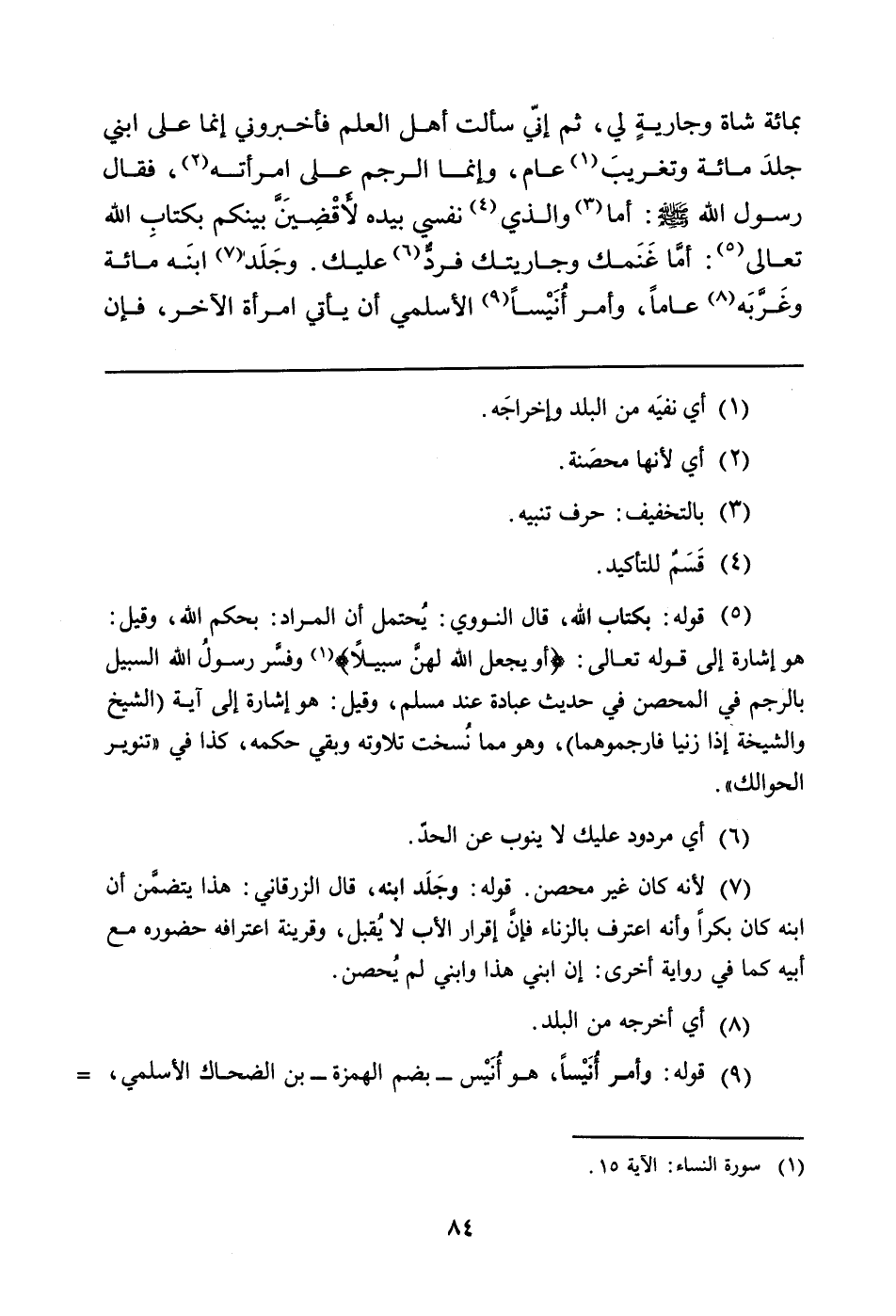 بِمِائَةِ شَاةٍ وجاريةٍ لِي، ثُمَّ إِنِّي سَأَلْتُ أَهْلَ الْعِلْمِ فَأَخْبَرُونِي إِنَّمَا عَلَى ابْنِي جلدَ مِائَةٍ وتغريبَ (¬1) عَامٍ، وَإِنَّمَا الرَّجْمُ عَلَى امْرَأَتِهِ (¬2) ، فقال رسول الله صلى الله عليه وسلم: أَمَا (¬3) وَالَّذِي (¬4) نَفْسِي بِيَدِهِ لأَقْضِيَنَّ بَيْنَكُمْ بكتابِ اللَّهِ تَعَالَى (¬5) : أمَّا غَنَمك وَجَارِيَتُكَ فردٌّ (¬6) عَلَيْكَ. وجَلَد (¬7) ابْنَهُ مِائَةً وغَرَّبَه (¬8) عَامًا، وَأَمَرَ أُنَيْساً (¬9) الأسلمي أن يأتي امرأة الآخر، فإن