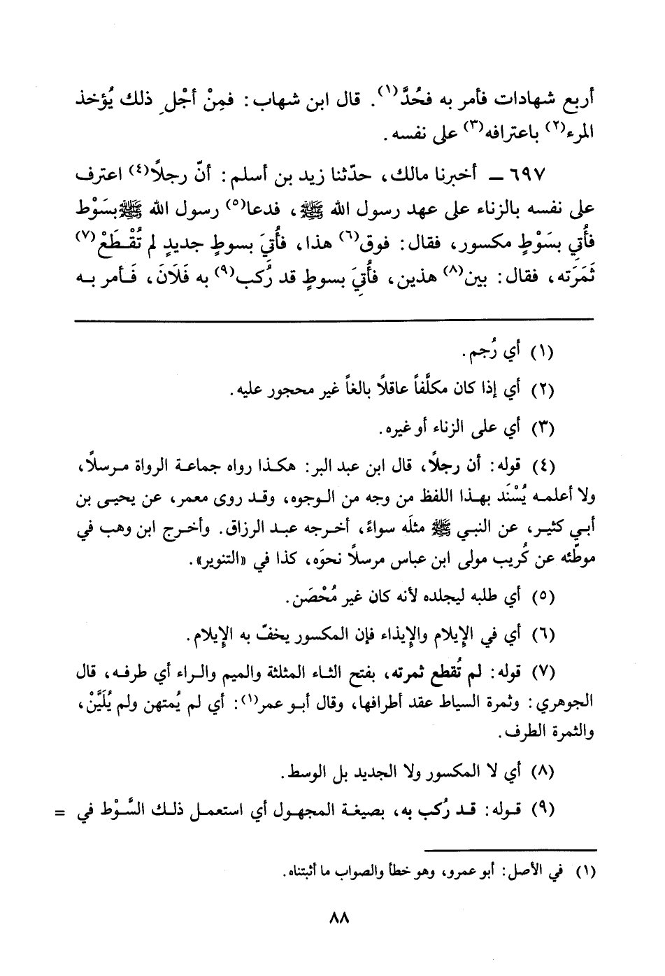 697 - أَخْبَرَنَا مَالِكٌ، حَدَّثَنَا زَيْدُ بْنُ أَسْلَمَ: أَنَّ رَجُلا (¬4) اعْتَرَفَ عَلَى نَفْسِهِ بِالزِّنَاءِ عَلَى عَهْدِ رَسُولِ اللَّهِ صَلَّى اللَّهُ عَلَيْهِ وَسَلَّمَ، فَدَعَا (¬5) رَسُولُ اللَّهِ صَلَّى اللَّهُ عَلَيْهِ وَسَلَّمَ بسَوْط فَأُتِيَ بسَوْطٍ مَكْسُورٍ، فَقَالَ: فَوْقَ (¬6) هَذَا، فأُتيَ بسوطٍ جَدِيدٍ لَمْ تُقْطَعْ (¬7) ثَمَرَته، فَقَالَ: بَيْنَ (¬8) هَذَيْنِ، فأُتِيَ بسوطٍ قَدْ رُكب (¬9) به فَلاَنَ، فِأمر به