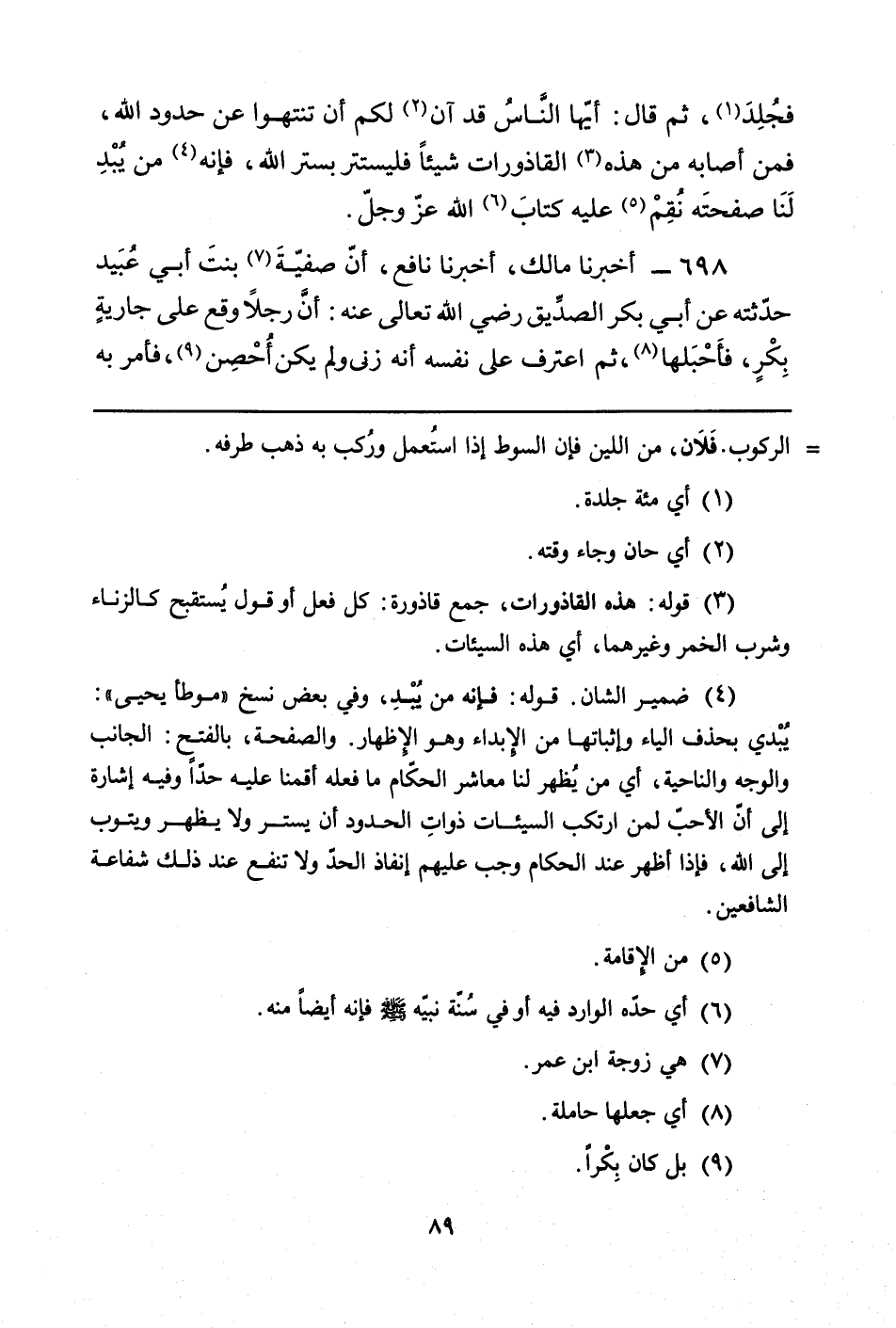 689 - أَخْبَرَنَا مَالِكٌ، أَخْبَرَنَا نَافِعٌ، أَنَّ صفيّةَ (¬7) بنتَ أَبِي عُبَيد حَدَّثَتْهُ عَنْ أَبِي بَكْرٍ الصدِّيق رَضِيَ اللَّهُ تَعَالَى عَنْهُ: أنَّ رَجُلا وَقَعَ عَلَى جاريةٍ بكْرٍ، فأَحْبَلها (¬8) ، ثُمَّ اعْتَرَفَ عَلَى نَفْسِهِ أَنَّهُ زَنَى وَلَمْ يَكُنْ أُحْصِن (¬9) ، فَأَمَرَ به