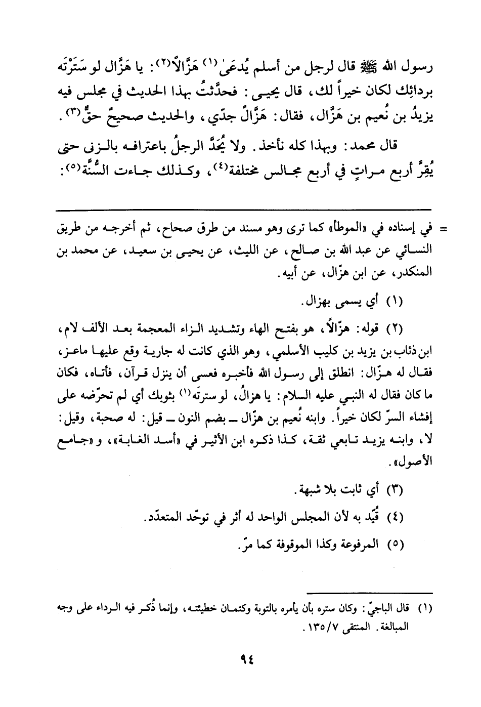 (¬2) قوله: هزّالاً، هو بفتح الهاء وتشديد الزاء المعجمة بعد الألف لام، ابن ذئاب بن زيد بن كليب الأسلمي، وهو الذي كانت له جارية وقع عليها ماعز، فقال له هزّال: انطلق إلى رسول الله فأخبره فعسى أن ينزل قرآن، فأتاه، فكان ما كان فقال له النبي عليه السلام: يا هزالُ، لو سترتَه (قال الباجيّ: وكان ستره بأن يأمره بالتوبة وكتمان خطيئته، وإنما ذُكر فيه الرداء على وجه المبالغة. المنتقى 7/135) بثوبك أي لم تحرّضه على إفشاء السرّ لكان خيراً. وابنه نُعيم بن هزّال - بضم النون - قيل: له صحبة، وقيل: لا، وابنه يزيد تابعي ثقة، كذا ذكره ابن الأثير في "أسد الغابة"، و "جامع الأصول".