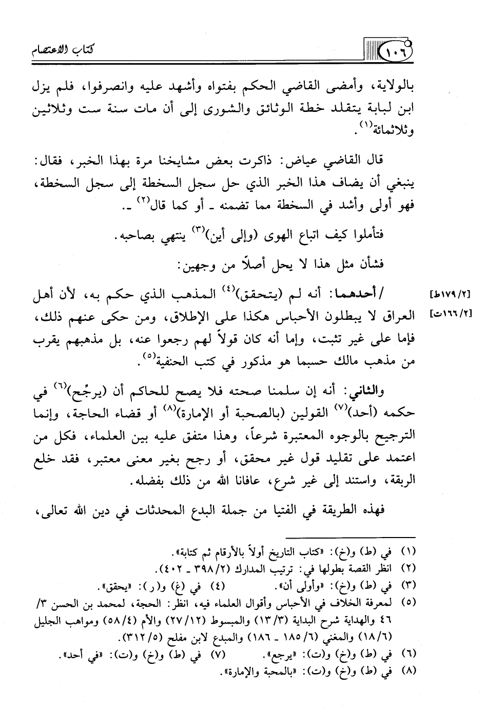 /أَحَدُهُمَا: أَنَّهُ لَمْ (يَتَحَقَّقِ) (¬4) الْمَذْهَبُ الَّذِي حَكَمَ بِهِ، لِأَنَّ أَهْلَ الْعِرَاقِ لَا يُبْطِلُونَ الْإِحْبَاسَ هَكَذَا عَلَى الْإِطْلَاقِ، وَمَنْ حكى عنهم ذلك، فإما على غير تثبت، وَإِمَّا أَنَّهُ كَانَ قَوْلًا لَهُمْ رَجَعُوا عَنْهُ، بَلْ مَذْهَبُهُمْ يَقْرُبُ مِنْ مَذْهَبِ مَالِكٍ حَسْبَمَا هو مذكور في كتب الحنفية (¬5).