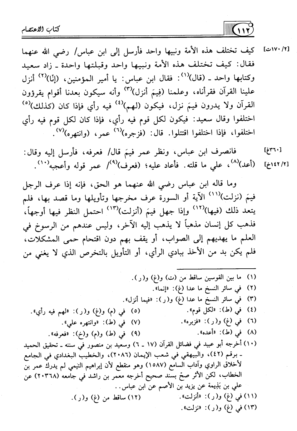 كَيْفَ تَخْتَلِفُ هَذِهِ الْأُمَّةُ وَنَبِيُّهَا وَاحِدٌ فَأَرْسَلَ إِلَى ابْنِ عَبَّاسٍ/ رَضِيَ اللَّهُ عَنْهُمَا فَقَالَ: كَيْفَ تَخْتَلِفُ هَذِهِ الْأُمَّةُ وَنَبِيُّهَا وَاحِدٌ وَقِبْلَتُهَا وَاحِدَةٌ ـ زَادَ سَعِيدٌ وَكِتَابُهَا وَاحِدٌ ـ (قَالَ) (¬1): فَقَالَ: ابن عباس يا أمير المؤمنين: (إنّا) (¬2) أنزل علينا القرآن فقرأناه، وعلمنا (فِيمَ أنزل) (¬3) وأنه سيكون بعدنا أقوام يقرؤون القرآن ولا يدرون فيمَ نزل، فيكون (لهم) (¬4) فِيهِ رَأْيٌ فَإِذَا كَانَ (كَذَلِكَ) (¬5) اخْتَلَفُوا وَقَالَ سَعِيدٌ: فَيَكُونُ لِكُلِّ قَوْمٍ فِيهِ رَأْيٌ، فَإِذَا كان لَكُلِّ قَوْمٍ فِيهِ رَأْيٌ اخْتَلَفُوا، فَإِذَا اخْتَلَفُوا اقتتلوا. قال: (فزجره) (¬6) عمر، (وانتهره) (¬7).