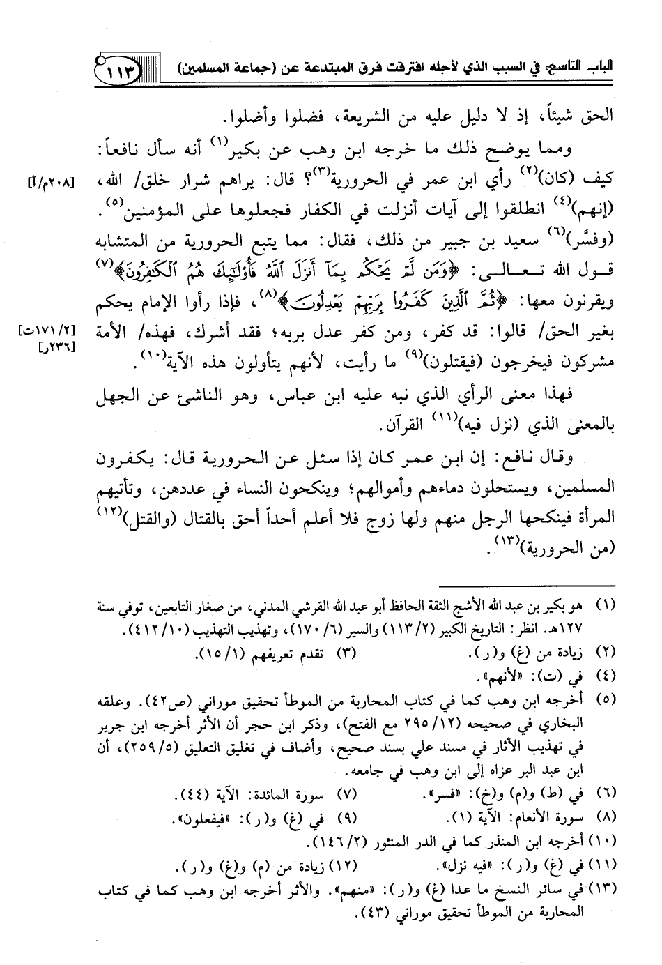(¬5) أخرجه ابن وهب كما في كتاب المحاربة من الموطأ تحقيق موراني (ص42). وعلقه البخاري في صحيحه (12 295 مع الفتح)، وذكر ابن حجر أن الأثر أخرجه ابن جرير في تهذيب الأثار في مسند علي بسند صحيح، وأضاف في تغليق التعليق (5 259)، أن ابن عبد البر عزاه إلى ابن وهب في جامعه.