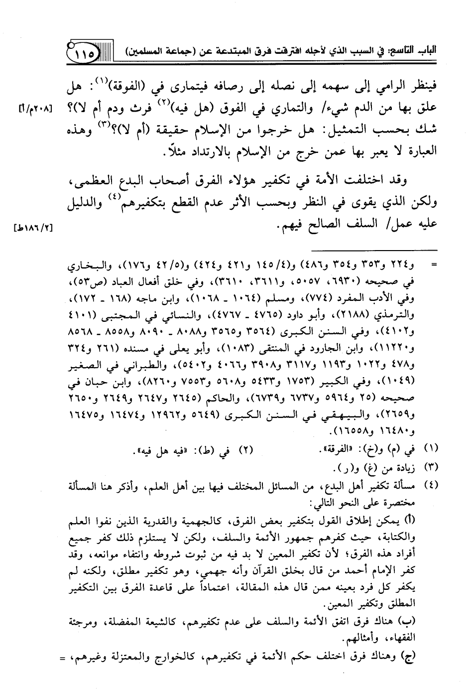 وَقَدِ اخْتَلَفَتِ الْأُمَّةُ فِي تَكْفِيرِ هَؤُلَاءِ الْفِرَقِ أَصْحَابِ الْبِدَعِ الْعُظْمَى، وَلَكِنَّ الَّذِي يَقْوَى فِي النَّظَرِ وَبِحَسَبِ الْأَثَرِ عَدَمُ الْقَطْعِ بِتَكْفِيرِهِمْ (¬4) وَالدَّلِيلُ عَلَيْهِ عَمَلُ/ السَّلَفِ الصالح فيهم.