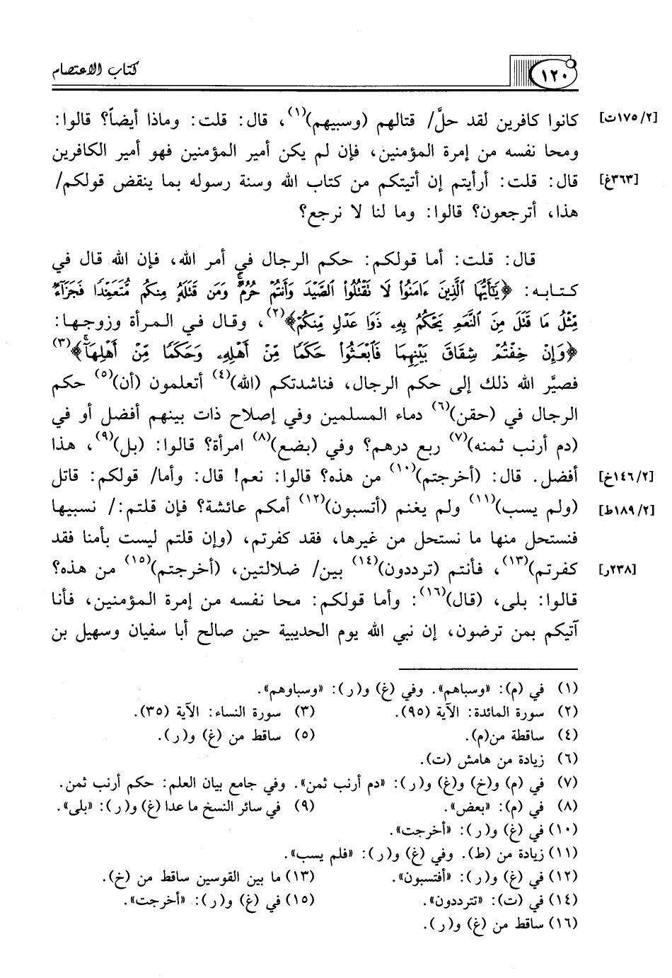 قال: قلت: أما قولكم: حكم الرجال في أمر الله، فإن الله قال في كتابه: {يَا أَيُّهَا الَّذِينَ آمَنُوا لاَ تَقْتُلُوا الصَّيْدَ وَأَنْتُمْ حُرُمٌ وَمَنْ قَتَلَهُ مِنْكُمْ مُتَعَمِّدًا فَجَزَاءٌ مِثْلُ مَا قَتَلَ مِنَ النَّعَمِ يَحْكُمُ بِهِ ذَوَا عَدْلٍ مِنْكُمْ} (¬2)، وقال في المرأة وزوجها: {وَإِنْ خِفْتُمْ شِقَاقَ بَيْنِهِمَا فَابْعَثُوا حَكَمًا مِنْ أَهْلِهِ وَحَكَمًا مِنْ أَهْلِهَا} (¬3) فصيَّر الله ذلك إلى حكم الرجال، فناشدتكم (الله) (¬4) أتعلمون (أن) (¬5) حكم الرجال في (حقن) (¬6) دماء المسلمين وفي إصلاح ذات بينهم أفضل أو في (دم أرنب ثمنه) (¬7) ربع درهم؟ وفي (بضع) (¬8) امرأة؟ قالوا: (بل) (¬9)، هذا أفضل. قال: (أخرجتم) (¬10) من هذه؟ قالوا: نعم! قال: وأما/ قولكم: قاتل (ولم يسب) (¬11) ولم يغنم (أتسبون) (¬12) أمكم عائشة؟ فإن قلتم:/ نسبيها فنستحل منها ما نستحل من غيرها، فقد كفرتم، (وإن قلتم ليست بأمنا فقد كفرتم) (¬13)، فأنتم (ترددون) (¬14) بين/ ضلالتين، (أخرجتم) (¬15) من هذه؟ قالوا: بلى، (قال) (¬16): وأما قولكم: محا نفسه من إمرة المؤمنين، فأنا آتيكم بمن ترضون، إن نبي الله يوم الحديبية حين صالح أبا سفيان وسهيل بن