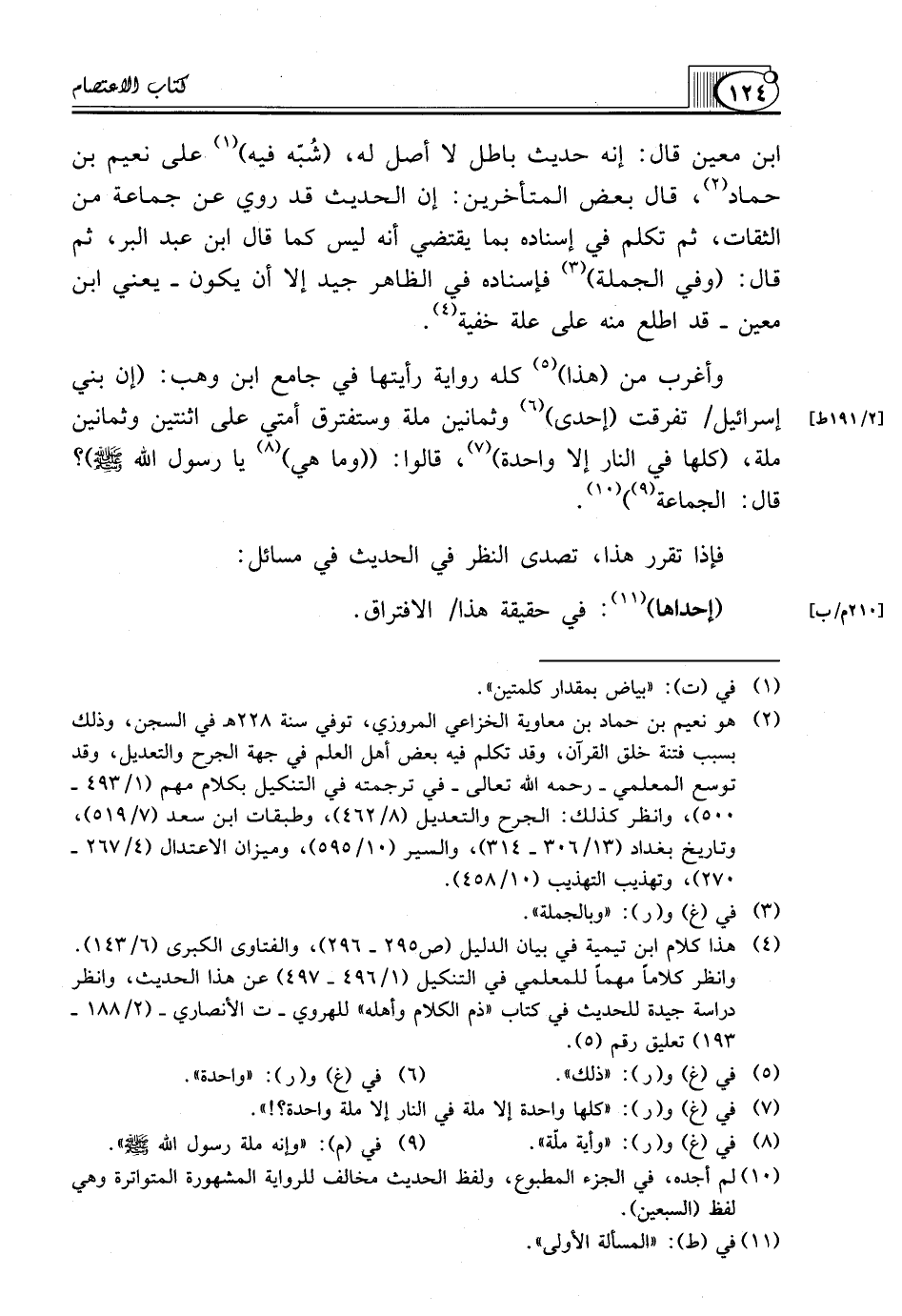 (¬2) هو نعيم بن حماد بن معاوية الخزاعي المروزي، توفي سنة 228هـ في السجن، وذلك بسبب فتنة خلق القرآن، وقد تكلم فيه بعض أهل العلم في جهة الجرح والتعديل، وقد توسع المعلمي ـ رحمه الله تعالى ـ في ترجمته في التنكيل بكلام مهم (1 493 ـ 500)، وانظر كذلك: الجرح والتعديل (8 462)، وطبقات ابن سعد (7 519)، وتاريخ بغداد (13 306 ـ 314)، والسير (10 595)، وميزان الاعتدال (4 267 ـ 270)، وتهذيب التهذيب (10 458).