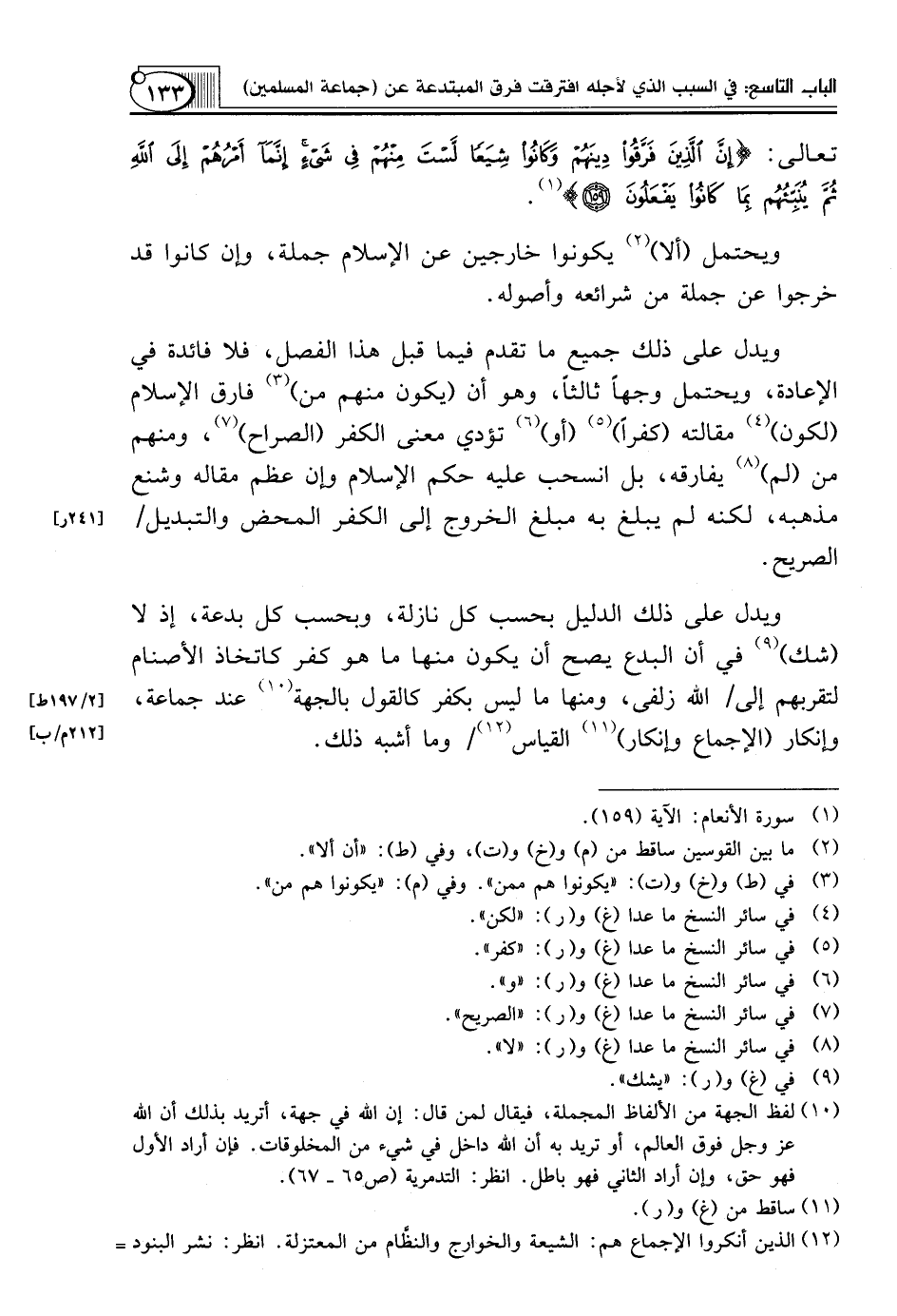 وَيَدُلُّ عَلَى ذَلِكَ جَمِيعُ مَا تَقَدَّمَ فِيمَا قَبْلَ هَذَا الْفَصْلِ، فَلَا فَائِدَةَ فِي الْإِعَادَةِ، وَيَحْتَمِلُ وَجْهًا ثَالِثًا، وَهُوَ أَنْ (يَكُونَ مِنْهُمْ من) (¬3) فارق الإسلام (لكون) (¬4) مقالته (كفراً) (¬5) (أو) (¬6) تؤدي معنى الكفر (الصراح) (¬7)، وَمِنْهُمْ مَنْ (لَمْ) (¬8) يُفَارِقْهُ، بَلِ انْسَحَبَ عَلَيْهِ حُكْمُ الْإِسْلَامِ وَإِنْ عَظُمَ مَقَالُهُ وَشُنِّعَ مَذْهَبُهُ، لَكِنَّهُ لَمْ يَبْلُغْ بِهِ مَبْلَغَ الْخُرُوجِ إِلَى الْكُفْرِ الْمَحْضِ وَالتَّبْدِيلِ/ الصَّرِيحِ.