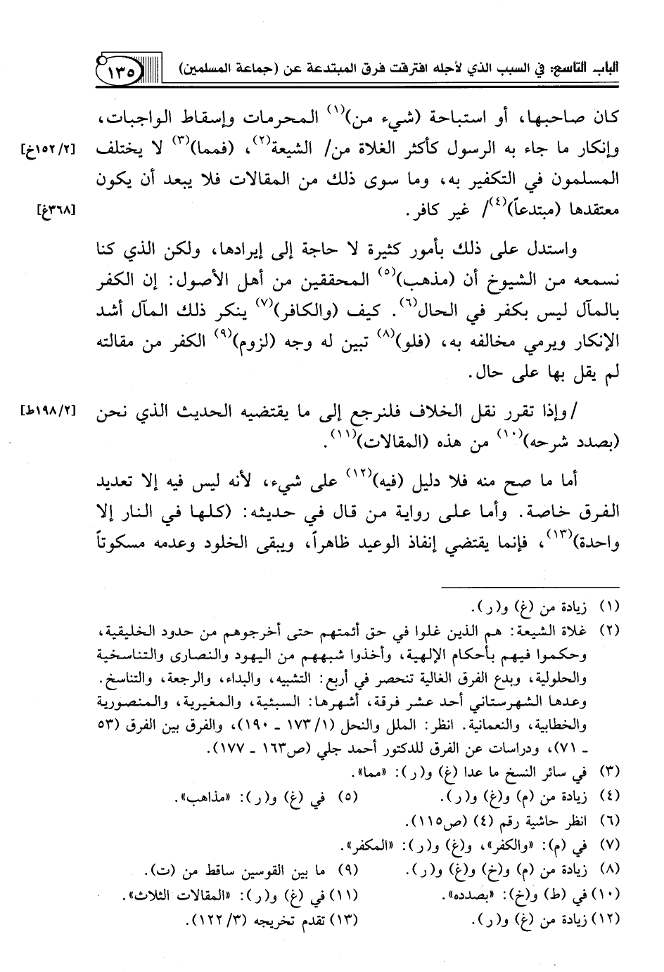 كان صاحبها، أو استباحة (شيء من) (¬1) الْمُحَرَّمَاتِ وَإِسْقَاطِ الْوَاجِبَاتِ، وَإِنْكَارِ مَا جَاءَ بِهِ الرسول كأكثر الغلاة من/ الشيعة (¬2)، (فمما) (¬3) لَا يَخْتَلِفُ الْمُسْلِمُونَ فِي التَّكْفِيرِ بِهِ، وَمَا سِوَى ذَلِكَ مِنَ الْمَقَالَاتِ فَلَا يَبْعَدُ أَنْ يكون معتقدها (مبتدعاً) / غَيْرَ كَافِرٍ.