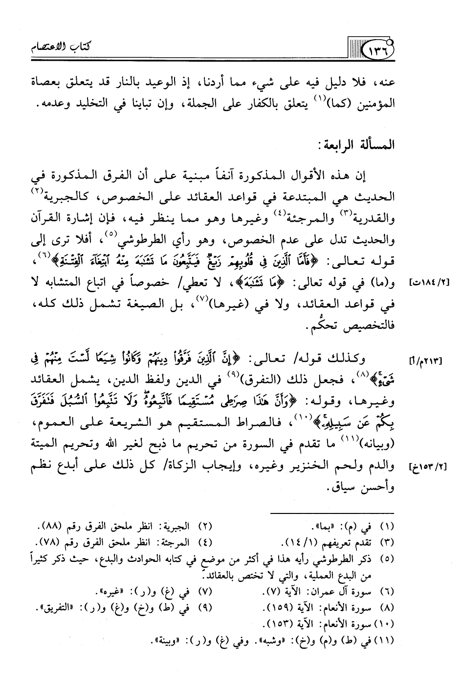 إِنَّ هَذِهِ الْأَقْوَالَ الْمَذْكُورَةَ آنِفًا مَبْنِيَّةٌ عَلَى أَنَّ الْفِرَقَ الْمَذْكُورَةَ فِي الْحَدِيثِ هِيَ الْمُبْتَدِعَةُ فِي قَوَاعِدِ الْعَقَائِدِ عَلَى الْخُصُوصِ، كَالْجَبْرِيَّةِ (¬2) وَالْقَدَرِيَّةِ (¬3) وَالْمُرْجِئَةِ (¬4) وَغَيْرِهَا وَهُوَ مِمَّا يُنْظَرُ فِيهِ، فَإِنَّ إِشَارَةَ الْقُرْآنِ وَالْحَدِيثِ تَدُلُّ عَلَى عَدَمِ الْخُصُوصِ، وَهُوَ رَأْيُ الطَّرْطُوشِيِّ (¬5)، أَفَلَا تَرَى إِلَى قَوْلِهِ تَعَالَى: {فَأَمَّا الَّذِينَ فِي قُلُوبِهِمْ زَيْغٌ فَيَتَّبِعُونَ مَا تَشَابَهَ مِنْهُ ابْتِغَاءَ الْفِتْنَةِ} (¬6)، و (ما) في قوله تعالى: {مَا تَشَابَهَ}، لَا تُعْطِي/ خُصُوصًا فِي اتِّبَاعِ الْمُتَشَابِهِ لَا فِي قَوَاعِدِ الْعَقَائِدِ، وَلَا فِي (غَيْرِهَا) (¬7)، بَلِ الصِّيغَةُ تَشْمَلُ ذَلِكَ كُلَّهُ، فَالتَّخْصِيصُ تحكُّم.