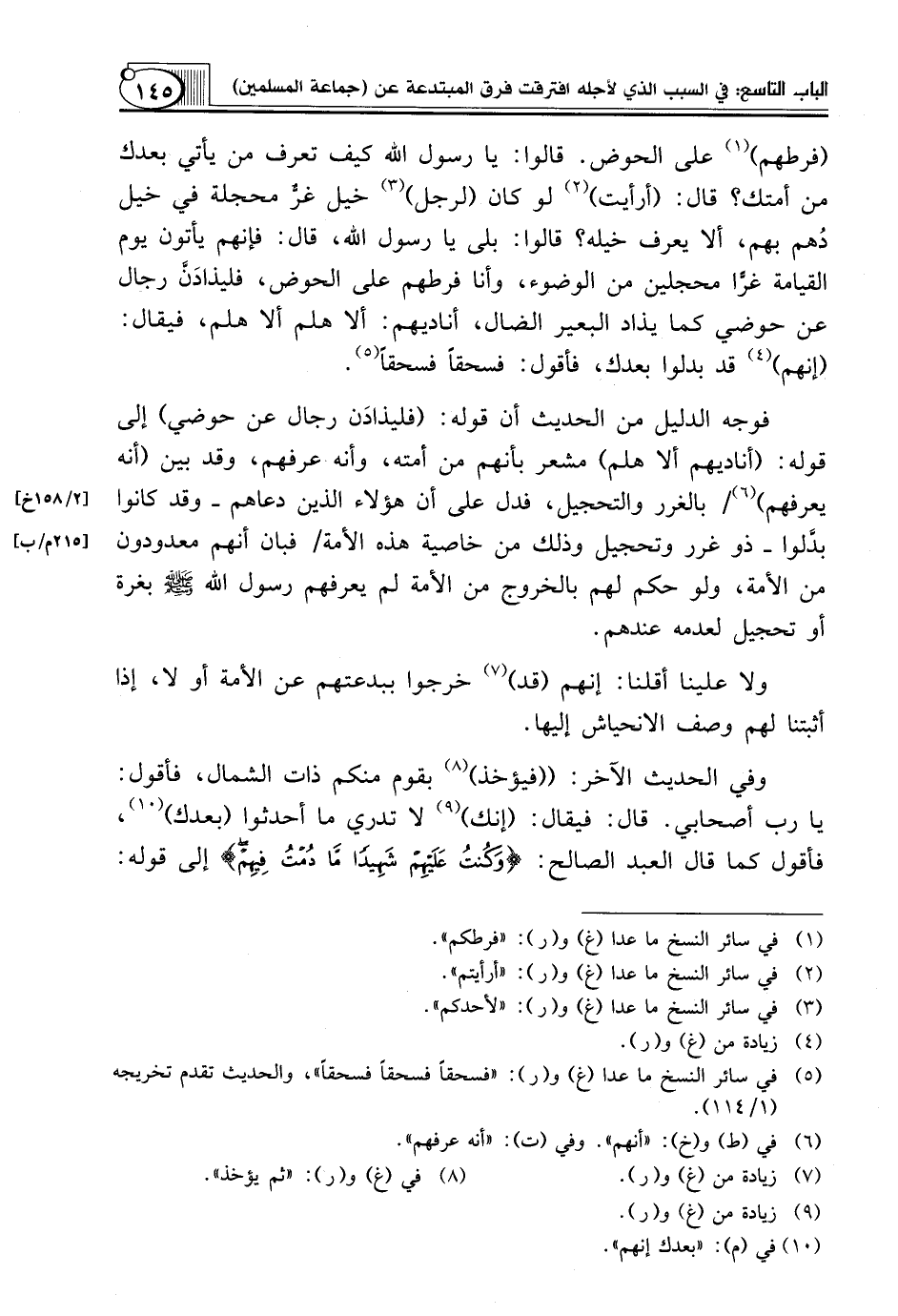 فَوَجْهُ الدَّلِيلِ مِنَ الْحَدِيثِ أَنَّ قَوْلَهُ: (فليذادَن رِجَالٌ عَنْ حَوْضِي) إِلَى قَوْلِهِ: (أُنَادِيهِمْ أَلَا هَلُمَّ) مُشْعِرٌ بِأَنَّهُمْ مِنْ أُمَّتِهِ، وَأَنَّهُ عَرَفَهُمْ، وقد بين (أنه يعرفهم) (¬6) / بِالْغُرَرِ وَالتَّحْجِيلِ، فَدَلَّ عَلَى أَنَّ هَؤُلَاءِ الَّذِينَ دعاهم ـ وقد كانوا بدَّلوا ـ ذو غُرَرٍ وَتَحْجِيلٍ وَذَلِكَ مِنْ خَاصِّيَّةِ هَذِهِ الْأُمَّةِ/ فَبَانَ أَنَّهُمْ مَعُدُودُونَ مِنَ الْأُمَّةِ، وَلَوْ حُكِمَ لَهُمْ بِالْخُرُوجِ مِنَ الْأُمَّةِ لَمْ يَعْرِفْهُمْ رَسُولُ اللَّهِ صَلَّى اللَّهُ عَلَيْهِ وَسَلَّمَ بِغُرَّةٍ أَوْ تَحْجِيلٍ لِعَدَمِهِ عِنْدَهُمْ.
