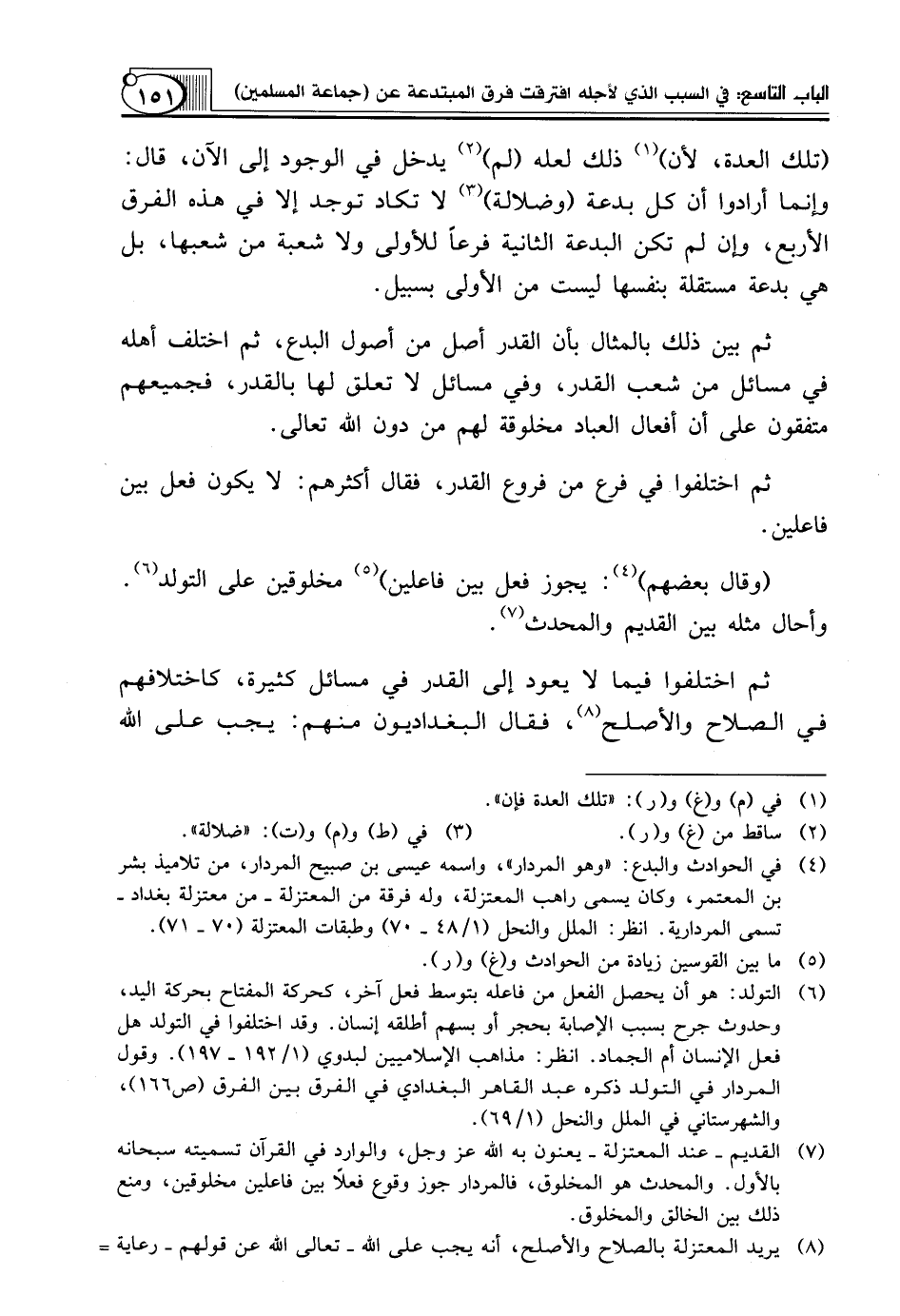 (¬7) القديم ـ عند المعتزلة ـ يعنون به الله عز وجل، والوارد في القرآن تسميته سبحانه بالأول. والمحدث هو المخلوق، فالمردار جوز وقوع فعلاً بين فاعلين مخلوقين، ومنع ذلك بين الخالق والمخلوق.