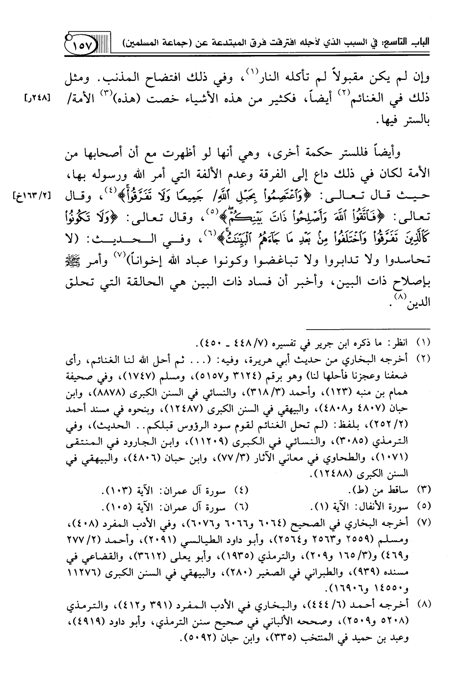 وَأَيْضًا فَلِلسَّتْرِ حِكْمَةٌ أُخْرَى، وَهِيَ أَنَّهَا لَوْ أُظْهِرَتْ مَعَ أَنَّ أَصْحَابَهَا مِنَ الْأُمَّةِ لَكَانَ فِي ذَلِكَ دَاعٍ إِلَى الْفُرْقَةِ وَعَدَمِ الْأُلْفَةِ الَّتِي أَمَرَ اللَّهُ وَرَسُولُهُ بِهَا، حَيْثُ قَالَ تَعَالَى: {وَاعْتَصِمُوا بِحَبْلِ اللهِ/ جَمِيعًا وَلاَ تَفَرَّقُوا} (¬4)، وَقَالَ تَعَالَى: {فَاتَّقُوا اللَّهَ وَأَصْلِحُوا ذَاتَ بَيْنِكُمْ} (¬5)، وَقَالَ تَعَالَى: {وَلاَ تَكُونُوا كَالَّذِينَ تَفَرَّقُوا وَاخْتَلَفُوا مِنْ بَعْدِ مَا جَاءَهُمُ الْبَيِّنَاتُ} (¬6)، وَفِي الْحَدِيثِ: (لَا تَحَاسَدُوا وَلَا تَدَابَرُوا وَلَا تباغضوا وكونوا عباد الله إخواناً) (¬7) وأمر صلّى الله عليه وسلّم بِإِصْلَاحِ ذَاتِ الْبَيْنِ، وَأَخْبَرَ أَنَّ فَسَادَ ذَاتِ البين هي الحالقة التي تحلق الدين (¬8).