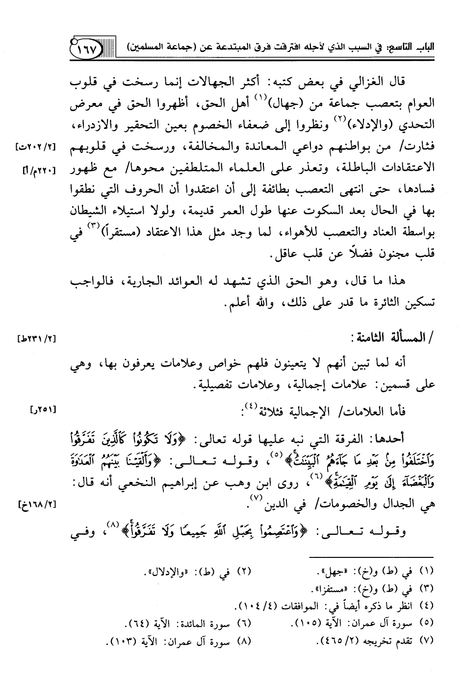 قَالَ الْغَزَالِيُّ فِي بَعْضِ كُتُبِهِ: أَكْثَرُ الْجَهَالَاتِ إِنَّمَا رَسَخَتْ فِي قُلُوبِ الْعَوَامِّ بِتَعَصُّبِ جَمَاعَةٍ مِنْ (جُهَّالِ) (¬1) أَهْلِ الْحَقِّ، أَظْهَرُوا الْحَقَّ فِي معرض التحدي (والإدلاء) (¬2) وَنَظَرُوا إِلَى ضُعَفَاءِ الْخُصُومِ بِعَيْنِ التَّحْقِيرِ وَالِازْدِرَاءِ، فَثَارَتْ/ مِنْ بَوَاطِنِهِمْ دَوَاعِي الْمُعَانَدَةِ وَالْمُخَالَفَةِ، وَرَسَخَتْ فِي قُلُوبِهِمُ الِاعْتِقَادَاتُ الْبَاطِلَةُ، وَتَعَذَّرَ عَلَى الْعُلَمَاءِ الْمُتَلَطِّفِينَ مَحْوُهَا/ مَعَ ظُهُورِ فَسَادِهَا، حَتَّى انْتَهَى التَّعَصُّبُ بِطَائِفَةٍ إِلَى أَنِ اعْتَقَدُوا أَنَّ الْحُرُوفَ الَّتِي نَطَقُوا بِهَا فِي الْحَالِ بَعْدَ السُّكُوتِ عَنْهَا طُولَ الْعُمُرِ قَدِيمَةٌ، وَلَوْلَا اسْتِيلَاءُ الشَّيْطَانِ بِوَاسِطَةِ الْعِنَادِ وَالتَّعَصُّبِ لِلْأَهْوَاءِ، لَمَا وُجِدَ مِثْلُ هذا الاعتقاد (مستقراً) (¬3) فِي قَلْبِ مَجْنُونٍ فَضْلًا عَنْ قَلْبِ عَاقِلٍ.