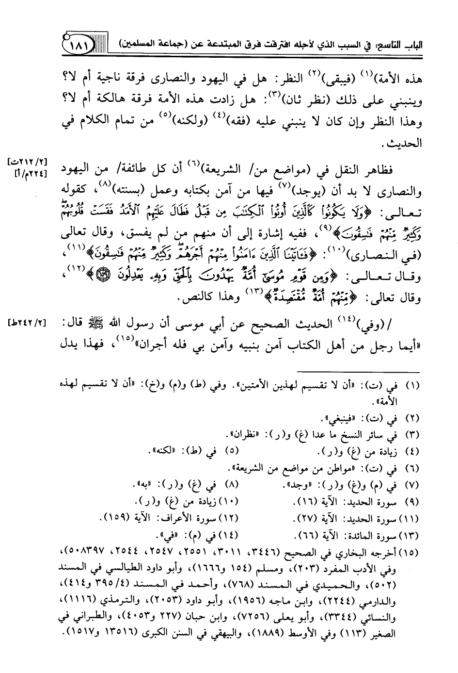 هذه الْأُمَّةِ) (¬1) (فَيَبْقَى) (¬2) النَّظَرُ: هَلْ فِي الْيَهُودِ وَالنَّصَارَى فِرْقَةٌ نَاجِيَةٌ أَمْ لَا؟ وَيَنْبَنِي عَلَى ذَلِكَ (نظر ثان) (¬3): هَلْ زَادَتْ هَذِهِ الْأُمَّةُ فِرْقَةً هَالِكَةً أَمْ لَا؟ وَهَذَا النَّظَرُ وَإِنْ كَانَ لَا يَنْبَنِي عليه (فقه) (¬4) (وَلَكِنَّهُ) (¬5) مِنْ تَمَامِ الْكَلَامِ فِي الْحَدِيثِ.