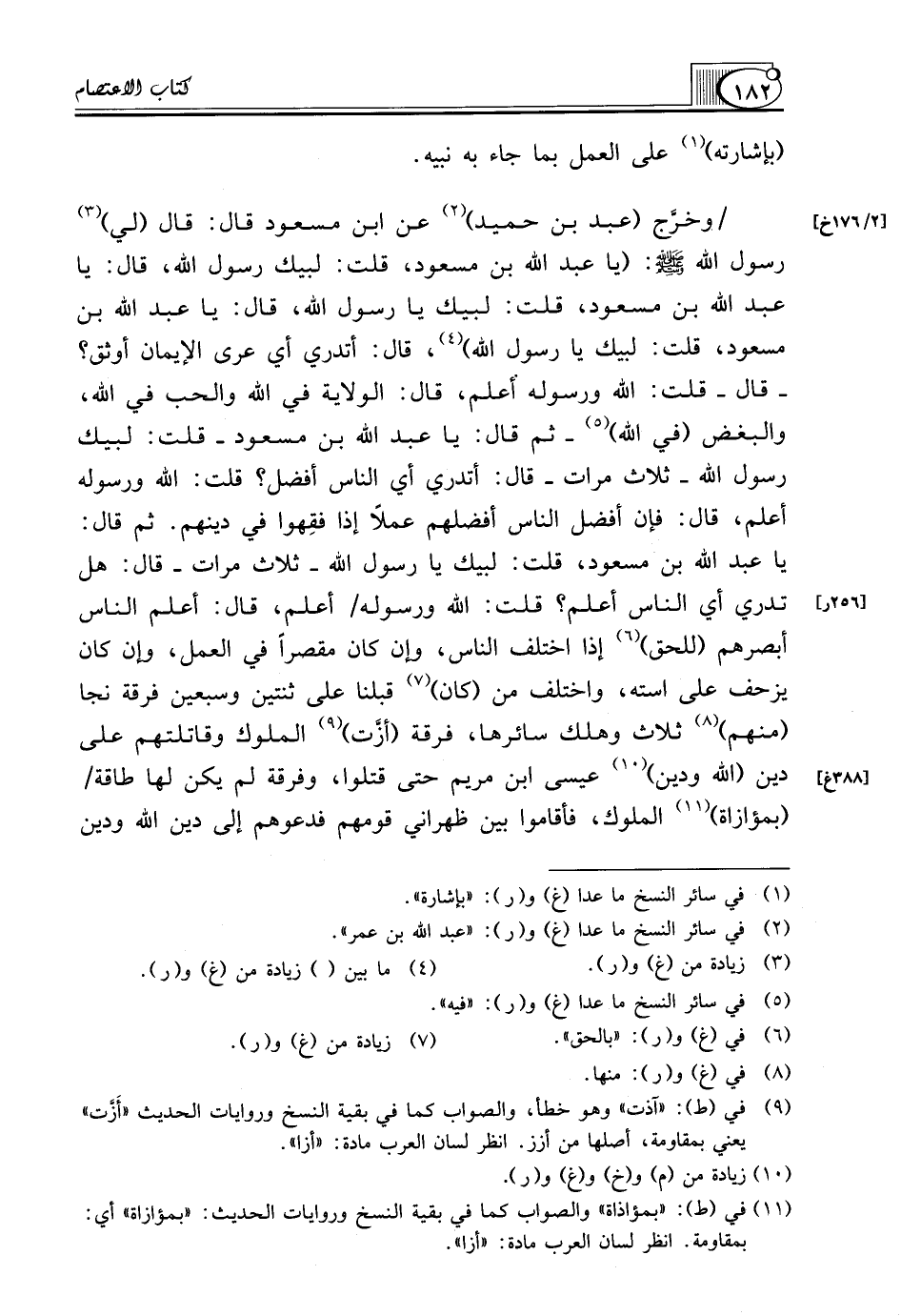 ثُمَّ قَالَ: يَا عَبْدَ اللَّهِ بْنَ مَسْعُودٍ، قُلْتُ: لَبَّيْكَ يَا رَسُولَ اللَّهِ ـ ثَلَاثَ مَرَّاتٍ ـ قَالَ: هَلْ تَدْرِي أي الناس أعلم؟ قلت: الله ورسوله/ أعلم، قَالَ: أَعْلَمُ النَّاسِ أَبْصَرُهُمْ (لِلْحَقِّ) (¬6) إِذَا اخْتَلَفَ النَّاسُ، وَإِنْ كَانَ مُقَصِّرًا فِي الْعَمَلِ، وَإِنْ كان يزحف على استه، وَاخْتَلَفَ مَنْ (كَانَ) (¬7) قَبْلَنَا عَلَى ثِنْتَيْنِ وَسَبْعِينَ فِرْقَةً نَجَا (مِنْهُمْ) (¬8) ثَلَاثٌ وَهَلَكَ سَائِرُهَا، فِرْقَةٌ (أزَّت) (¬9) الْمُلُوكَ وَقَاتَلَتْهُمْ عَلَى دِينِ (اللَّهِ وَدِينِ) (¬10) عيسى بن مريم حتى قتلوا، وفرقة لم يكن لها طاقة/ (بمؤازاة) (¬11) الْمُلُوكِ، فَأَقَامُوا بَيْنَ ظَهْرَانَيْ قَوْمِهِمْ فَدَعَوْهُمْ إِلَى دين الله ودين
