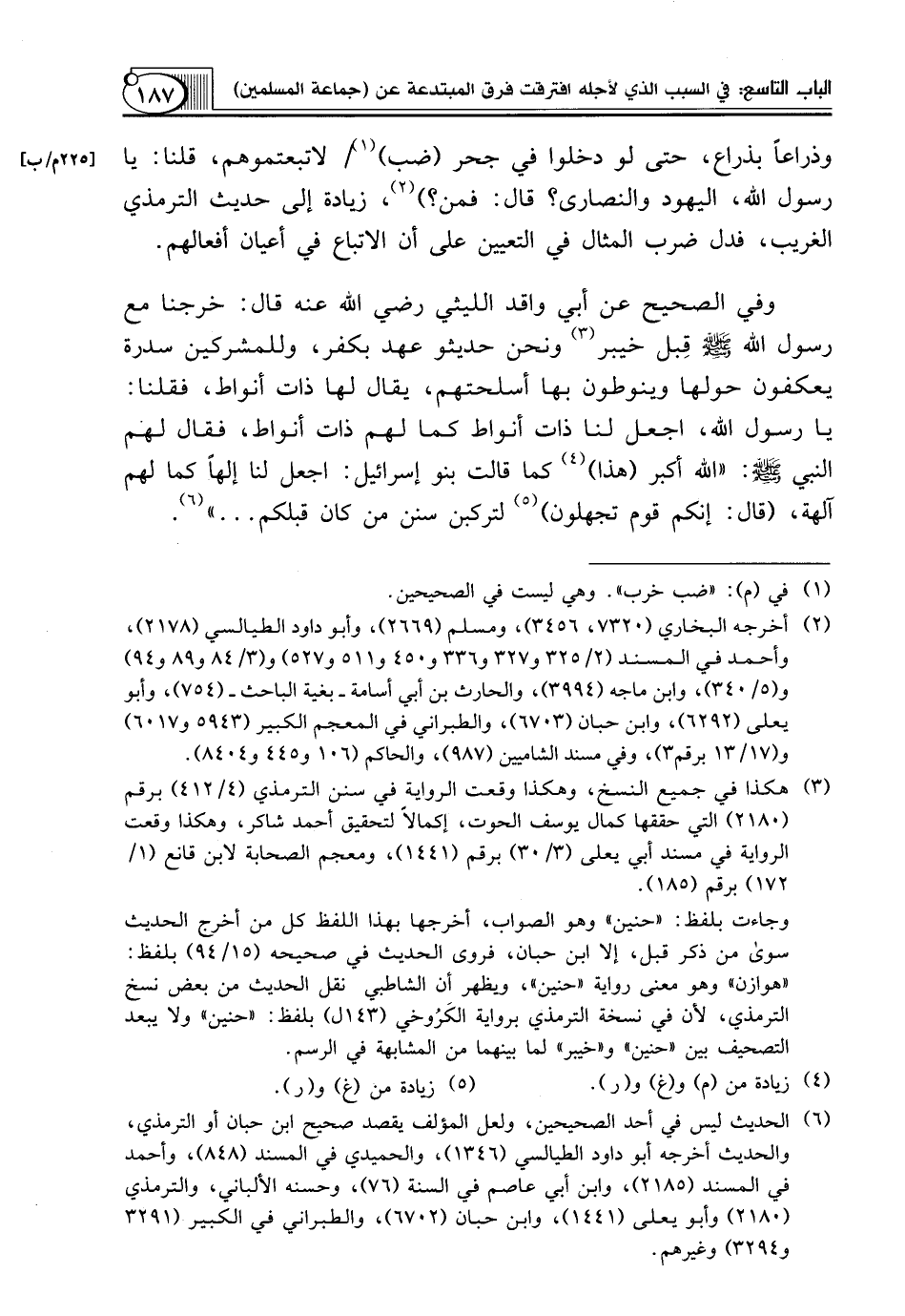 (¬6) الحديث ليس في أحد الصحيحين، ولعل المؤلف يقصد صحيح ابن حبان أو الترمذي، والحديث أخرجه أبو داود الطيالسي (1346)، والحميدي في المسند (848)، وأحمد في المسند (2185)، وابن أبي عاصم في السنة (76)، وحسنه الألباني، والترمذي (2180) وأبو يعلى (1441)، وابن حبان (6702)، والطبراني في الكبير (3291 و3294) وغيرهم.