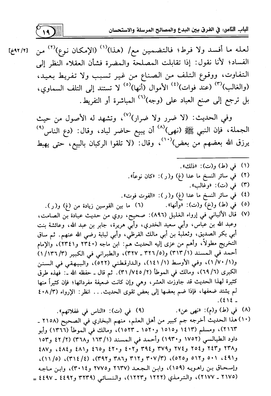 وَفِي الْحَدِيثِ: (لَا ضَرَرَ ولا ضرار) (¬7)، وتشهد لَهُ الْأُصُولُ مِنْ حَيْثُ الْجُمْلَةُ، فَإِنَّ النَّبِيَّ صلّى الله عليه وسلّم (نهى) (¬8) أَنْ يَبِيعَ حَاضِرٌ لِبَادٍ، وَقَالَ: (دَعِ النَّاسَ (¬9) يَرْزُقُ اللَّهُ بَعْضَهُمْ مِنْ بَعْضٍ) (¬10)، وَقَالَ: (لَا تلقوا الركبان بالبيع، حتى يهبط