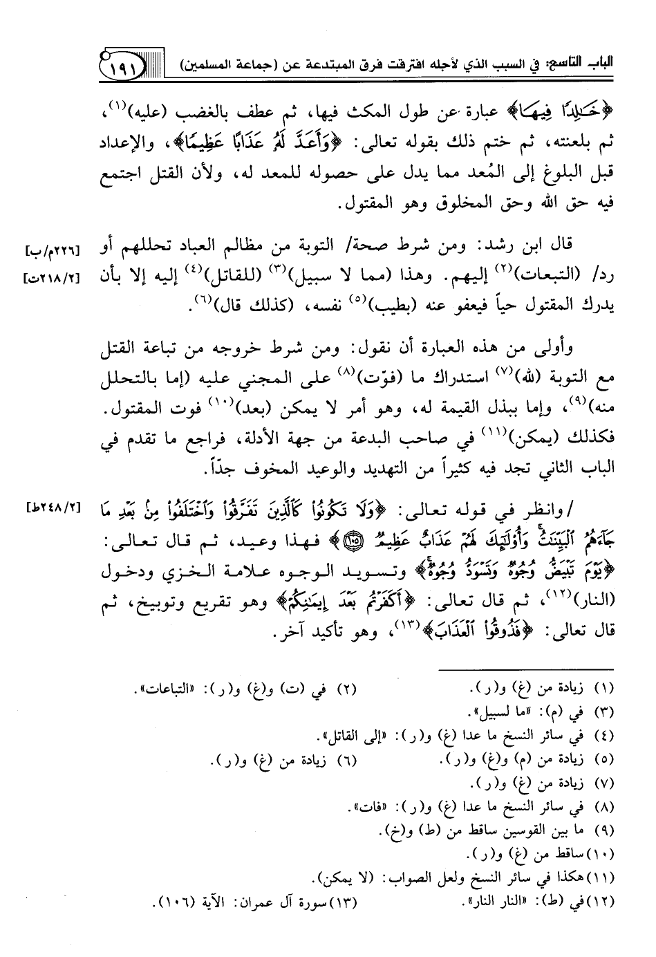 وَأَوْلَى مِنْ هَذِهِ الْعِبَارَةِ أَنْ نَقُولَ: وَمِنْ شَرْطِ خُرُوجِهِ مِنْ تِبَاعَةِ الْقَتْلِ مَعَ التَّوْبَةِ (لله) (¬7) استدراك ما (فوّت) (¬8) على المجني عليه (إما بالتحلل منه) (¬9)، وإما بِبَذْلِ الْقِيمَةِ لَهُ، وَهُوَ أَمْرٌ لَا يُمْكِنُ (بعد) (¬10) فوت المقتول. فكذلك (يُمْكِنُ) (¬11) فِي صَاحِبِ الْبِدْعَةِ مِنْ جِهَةِ الْأَدِلَّةِ، فَرَاجِعْ مَا تَقَدَّمَ فِي الْبَابِ الثَّانِي تَجِدُ فِيهِ كَثِيرًا مِنَ التَّهْدِيدِ وَالْوَعِيدِ الْمُخَوِّفِ جِدًّا.