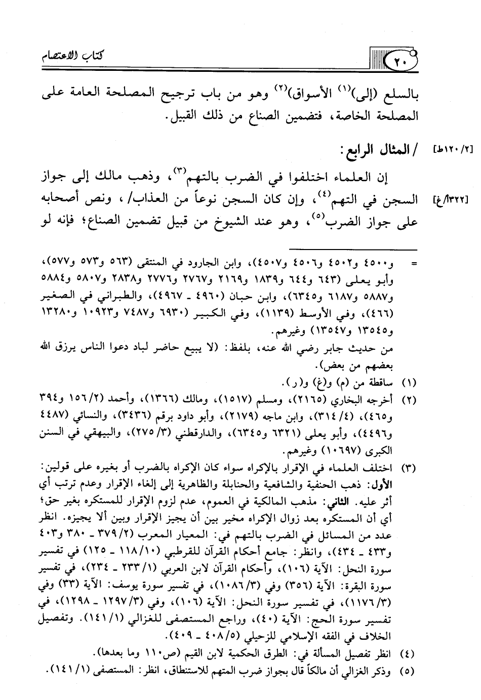 (¬3) اختلف العلماء، في الإقرار بالإكراه سواء كان الإكراه بالضرب أو بغيره على قولين: الأول: ذهب الحنفية والشافعية والحنابلة والظاهرية إلى إلغاء الإقرار وعدم ترتب أي أثر عليه. الثاني: مذهب المالكية في العموم، عدم لزوم الإقرار للمستكره بغير حق؛ أي أن المستكره بعد زوال الإكراه مخير بين أن يجيز الإقرار وبين ألا يجيزه. انظر عدد من المسائل في الضرب بالتهم في: المعيار المعرب (2 379 ـ 380 و403 و433 ـ 434)، وانظر: جامع أحكام القرآن للقرطبي (10 118 ـ 125) في تفسير سورة النحل: الآية (106)، وأحكام القرآن لابن العربي (1 233 ـ 234)، في تفسير سورة البقرة: الآية (356) وفي (3 1086)، في تفسير سورة يوسف: الآية (33) وفي (3 1176)، في تفسير سورة النحل: الآية (106)، وفي (3 1297 ـ 1298)، في تفسير سورة الحج: الآية (40)، وراجع المستصفى للغزالي (1 141). وتفصيل الخلاف في الفقه الإسلامي للزحيلي (5 408 ـ 409).