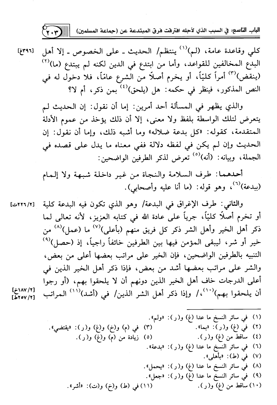 كلي وقاعدة عامة، (لم) (¬1) يَنْتَظِمِ/ الْحَدِيثُ ـ عَلَى الْخُصُوصِ ـ إِلَّا أَهْلَ الْبِدَعِ الْمُخَالِفِينَ لِلْقَوَاعِدِ، وَأَمَّا مَنِ ابْتَدَعَ فِي الدِّينِ لَكِنَّهُ لَمْ يَبْتَدِعْ (مَا) (¬2) (يَنْقُضُ) (¬3) أَمْرًا كُلِّيًّا، أَوْ يَخْرِمُ أَصْلًا مِنَ الشَّرْعِ عَامًّا، فَلَا دُخُولَ لَهُ فِي النَّصِّ الْمَذْكُورِ، فَيُنْظَرُ فِي حكمه: هل (يلحق) (¬4) بمن ذكر، أم لَا؟