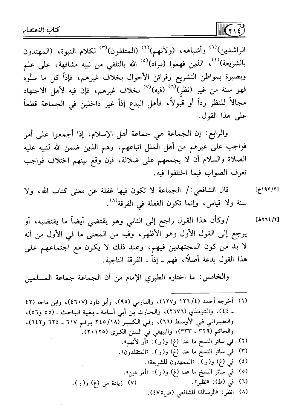/وَكَأَنَّ هَذَا الْقَوْلَ راجع إِلَى الثَّانِي وَهُوَ يَقْتَضِي أَيْضًا مَا يَقْتَضِيهِ، أَوْ يَرْجِعُ إِلَى الْقَوْلِ الْأَوَّلِ وَهُوَ الْأَظْهَرُ، وَفِيهِ مِنَ الْمَعْنَى مَا فِي الْأَوَّلِ مِنْ أنه لا بد مِنْ كَوْنِ الْمُجْتَهِدِينَ فِيهِمْ، وَعِنْدَ ذَلِكَ لَا يَكُونُ مَعَ اجْتِمَاعِهِمْ عَلَى هَذَا الْقَوْلِ بِدْعَةٌ أصلاً، فهم ـ إذاً ـ الفرقة الناجية.