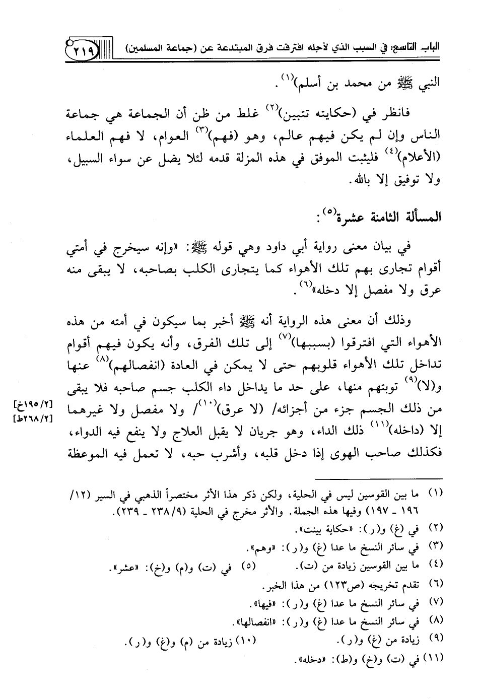 فِي بَيَانِ مَعْنَى رِوَايَةِ أبي داود وهي قَوْلِهِ صَلَّى اللَّهُ عَلَيْهِ وَسَلَّمَ: "وَإِنَّهُ سَيَخْرُجُ في أمتي أقوام تجارى بهم تلك الأهواء كَمَا يَتَجَارَى الْكَلْبُ بِصَاحِبِهِ، لَا يَبْقَى مِنْهُ عِرْقٌ وَلَا مَفْصِلٌ إِلَّا دَخَلَهُ" (¬6).
