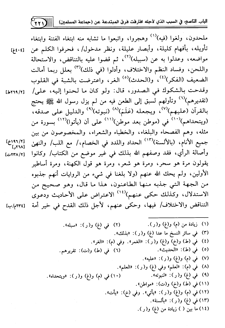 ملحدون، ولغوا (فيه) (¬1) وَهَجَرُوا، وَاتَّبَعُوا مَا تَشَابَهَ مِنْهُ ابْتِغَاءَ الْفِتْنَةِ وَابْتِغَاءَ تَأْوِيلِهِ، بِأَفْهَامٍ كَلَيْلَةٍ، وَأَبْصَارٍ عَلِيلَةٍ، وَنَظَرٍ مَدْخُولٍ/، فَحَرَّفُوا الْكَلِمَ عَنْ مَوَاضِعِهِ، وَعَدَلُوا بِهِ عَنْ (سَبِيلِهِ) (¬2)، ثُمَّ قَضُوا عَلَيْهِ بِالتَّنَاقُضِ، وَالِاسْتِحَالَةِ واللحن، وفساد النظم والاختلاف، وأدلوا (في ذلك) (¬3) بعلل ربما أمالت الضعيف (الفكر) (¬4)، و (الحدث) (¬5) الغر، واعترضت بالشبة فِي الْقُلُوبِ وَقَدَحَتْ بِالشُّكُوكِ فِي الصُّدُورِ، قَالَ: ولو كان ما لحنوا إليه، على/ (تقديرهم) (¬6) وتأولهم لَسَبَقَ إِلَى الطَّعْنِ فِيهِ مَنْ لَمْ يَزَلْ رَسُولُ اللَّهِ صَلَّى اللَّهُ عَلَيْهِ وَسَلَّمَ يَحْتَجُّ بِالْقُرْآنِ (عَلَيْهِمْ) (¬7)، وَيَجْعَلُهُ (عَلَمَ) (¬8) (نَبُّوتِهِ) (¬9) وَالدَّلِيلَ عَلَى صدقه، (ويتحداهم) (¬10) في (موطن بعد موطن) (¬11) عَلَى أَنْ (يَأْتُوا) (¬12) بِسُورَةٍ مِنْ مِثْلِهِ، وَهُمُ الْفُصَحَاءُ وَالْبُلَغَاءُ، وَالْخُطَبَاءُ وَالشُّعَرَاءُ، وَالْمَخْصُوصُونَ مِنْ بَيْنِ جميع الأنام، (بالألسنة) (¬13) الْحِدَادِ وَاللَّدَدِ فِي الْخِصَامِ،/ مَعَ اللُّبِّ/ وَالنُّهَى وَأَصَالَةِ الرَّأْيِ، فَقَدْ وَصَفَهُمُ اللَّهُ بِذَلِكَ فِي غَيْرِ مَوْضِعٍ مِنَ الْكِتَابِ/ وَكَانُوا يَقُولُونَ مَرَّةً هُوَ سِحْرٌ، وَمَرَّةً هُوَ شِعْرٌ، وَمَرَّةً هُوَ قَوْلُ الْكَهَنَةِ، وَمَرَّةً أَسَاطِيرُ الْأَوَّلِينَ، وَلَمْ يَحْكِ الله عنهم (ولا بلغنا في شيء من الروايات أنهم جذبوه من الجهة التي جذبه منها الطاعنون، هذا ما قال، وهو صحيح من الاستدلال، وكذلك حكى عَنْهُمُ) (¬14) الِاعْتِرَاضَ عَلَى الْأَحَادِيثِ وَدَعْوَى التَّنَاقُضِ وَالِاخْتِلَافِ/ فِيهَا، وَحُكِيَ عَنْهُمْ، لِأَجْلِ ذَلِكَ الْقَدْحُ فِي خير أمة