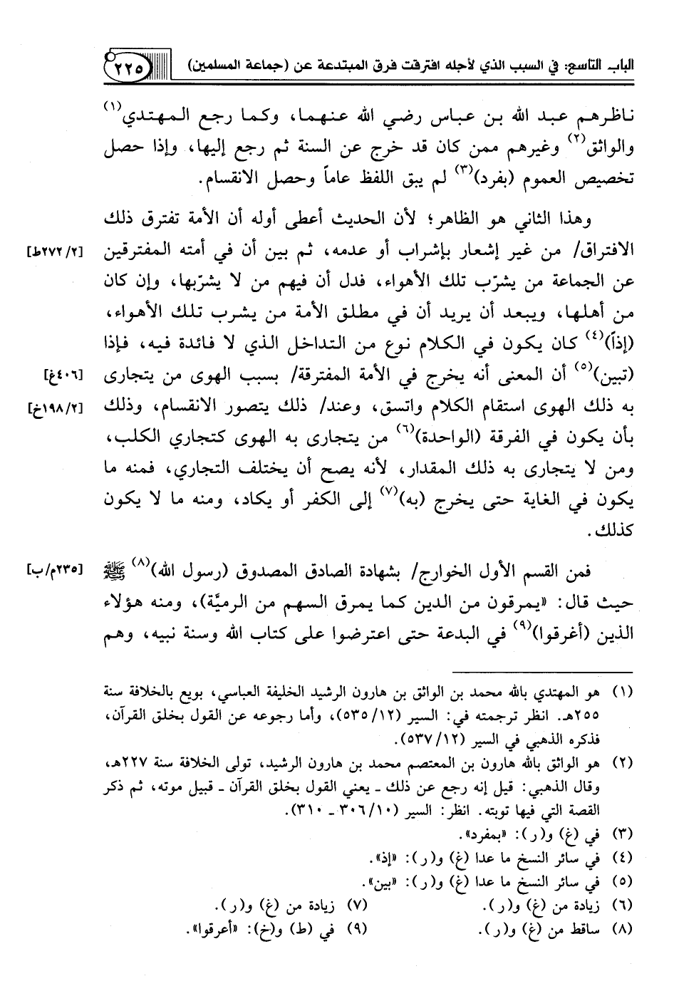 فَمِنَ الْقَسَمِ الْأَوَّلِ الْخَوَارِجُ/ بِشَهَادَةِ الصَّادِقِ الْمَصْدُوقِ (رَسُولِ اللَّهِ) (¬8) صَلَّى اللَّهُ عَلَيْهِ وَسَلَّمَ حَيْثُ قَالَ: "يَمْرُقُونَ مِنَ الدِّينِ كَمَا يَمْرُقُ السَّهْمُ مِنَ الرميَّة)، وَمِنْهُ هَؤُلَاءِ الَّذِينَ (أُغِرِقُوا) (¬9) فِي الْبِدْعَةِ حَتَّى اعْتَرَضُوا عَلَى كِتَابِ الله وسنة نبيه، وهم