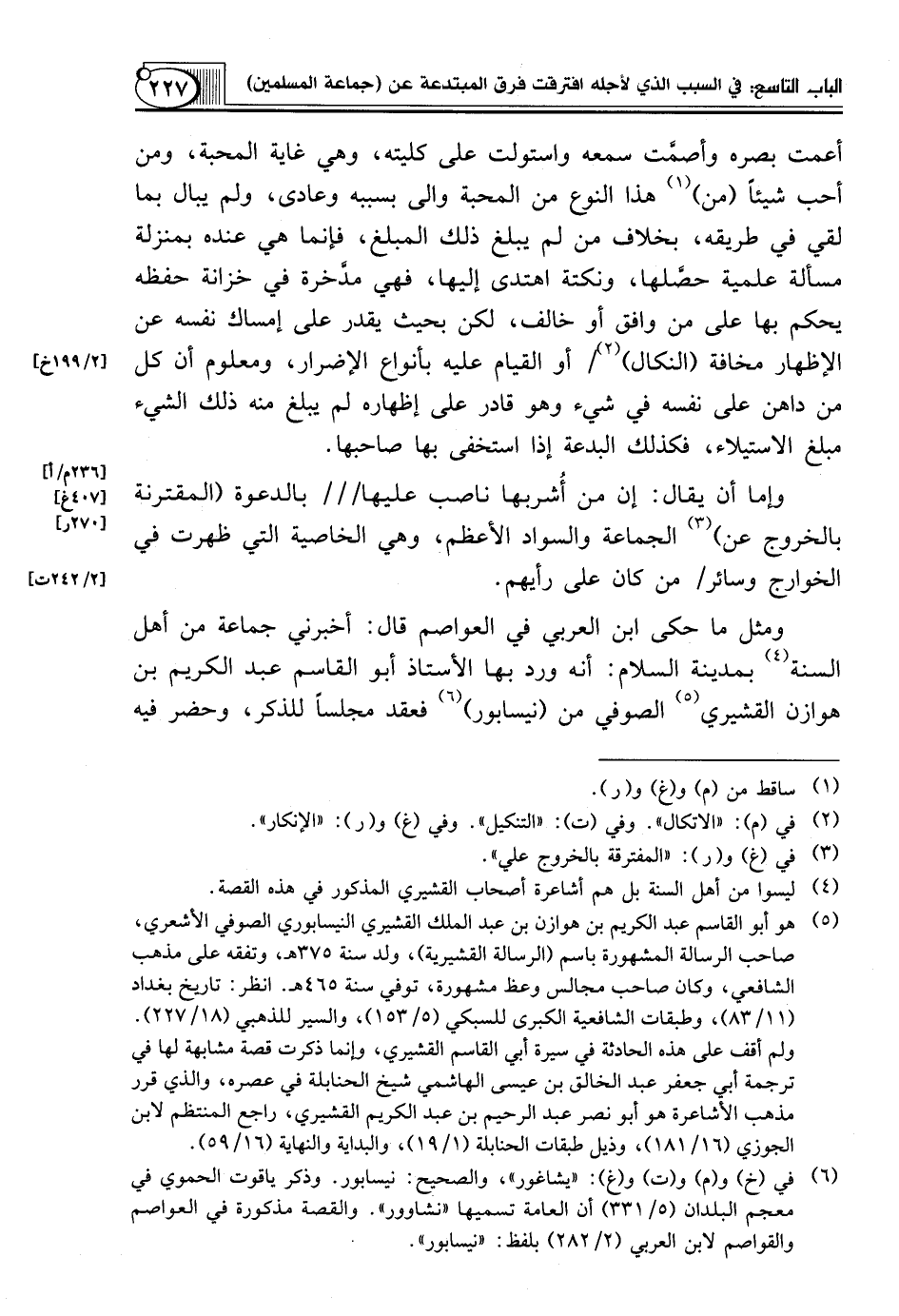 (¬5) هو أبو القاسم عبد الكريم بن هوازن بن عبد الملك القشيري النيسابوري الصوفي الأشعري، صاحب الرسالة المشهورة باسم (الرسالة القشيرية)، ولد سنة 375هـ، وتفقه على مذهب الشافعي، وكان صاحب مجالس وعظ مشهورة، توفي سنة 465هـ. انظر: تاريخ بغداد (11 83)، وطبقات الشافعية الكبرى للسبكي (5 153)، والسير للذهبي (18 227). ولم أقف على هذه الحادثة في سيرة أبي القاسم القشيري، وإنما ذكرت قصة مشابهة لها في ترجمة أبي جعفر عبد الخالق بن عيسى الهاشمي شيخ الحنابلة في عصره، والذي قرر مذهب الأشاعرة هو أبو نصر عبد الرحيم بن عبد الكريم القشيري، راجع المنتظم لابن الجوزي (16/ 181)، وذيل طبقات الحنابلة (1/ 19)، والبداية والنهاية (16/ 59).