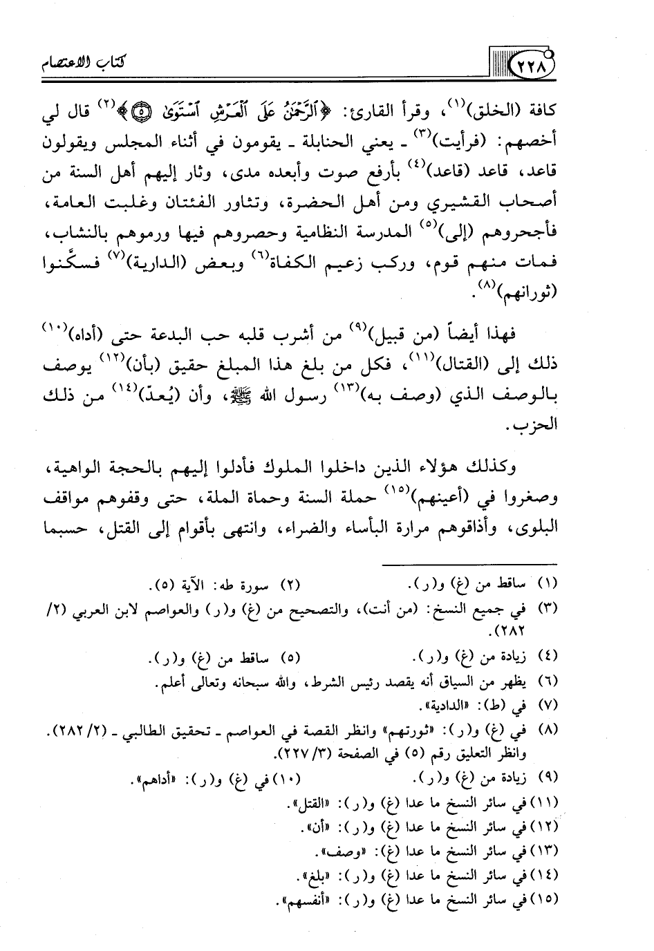فهذا أيضاً (من قبيل) (¬9) من أُشْرِبَ قَلْبُهُ حُبَّ الْبِدْعَةِ حَتَّى (أَدَّاهُ) (¬10) ذَلِكَ إلى (القتال) (¬11)، فكل من بلغ هذا المبلغ حقيق (بأن) (¬12) يُوصَفَ بِالْوَصْفِ الَّذِي (وُصِفَ بِهِ) (¬13) رَسُولُ اللَّهِ صلّى الله عليه وسلّم، وأن (يُعدّ) (¬14) من ذلك الحزب.