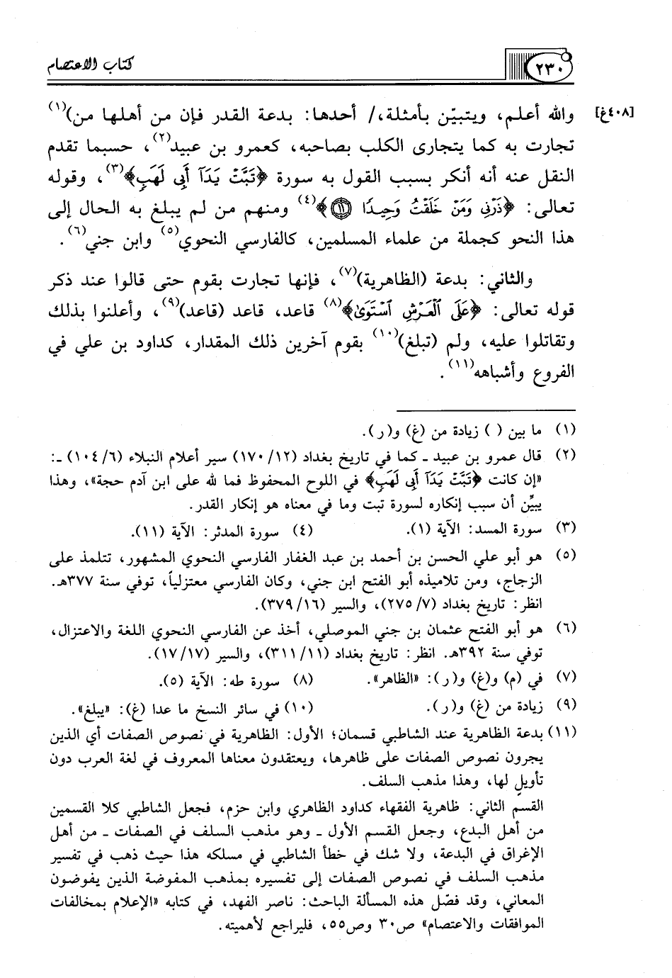 (¬11) بدعة الظاهرية عند الشاطبي قسمان؛ الأول: الظاهرية في نصوص الصفات أي الذين يجرون نصوص الصفات على ظاهرها، ويعتقدون معناها المعروف في لغة العرب دون تأويلٍ لها، وهذا مذهب السلف.