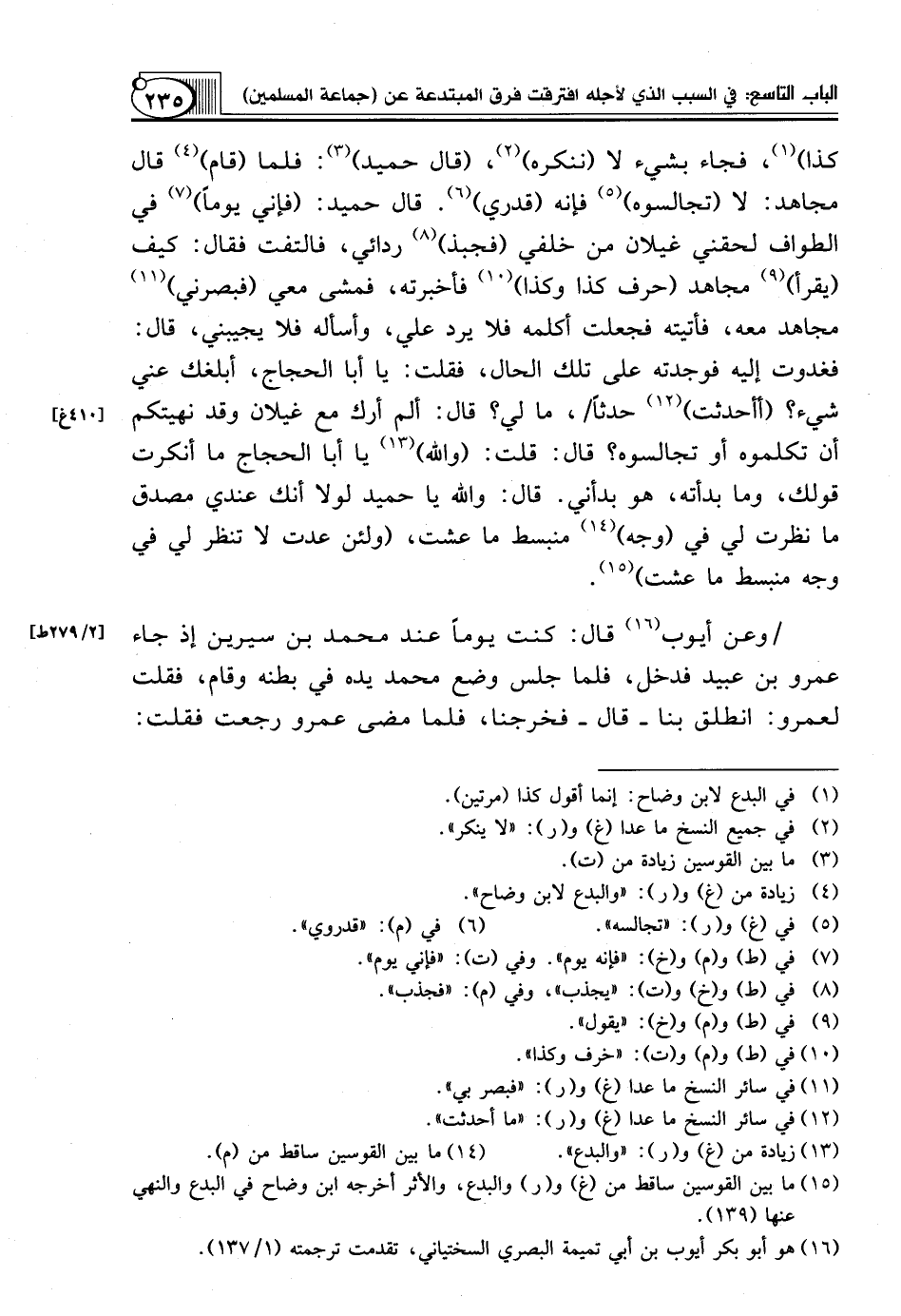 كذا) (¬1)، فجاء بشيء لا (ننكره) (¬2)، (قال حميد) (¬3): فَلَمَّا (قَامَ) (¬4) قَالَ مُجَاهِدٌ: لَا (تُجَالِسُوهُ) (¬5) فَإِنَّهُ (قدري) (¬6). قال حميد: (فإني يوماً) (¬7) في الطواف لحقني غيلان من خلفي (فجبذ) (¬8) ردائي، فالتفت فقال: كيف (يقرأ) (¬9) مجاهد (حرف كذا وكذا) (¬10) فأخبرته، فمشى معي (فبصرني) (¬11) مُجَاهِدٌ مَعَهُ، فَأَتَيْتُهُ فَجَعَلْتُ أُكَلِّمُهُ فَلَا يَرُدُّ علي، وأسأله فلا يجيبني، قال: فَغَدَوْتُ إِلَيْهِ فَوَجَدْتُهُ عَلَى تِلْكَ الْحَالِ، فَقُلْتُ: يا أبا الحجاج، أبلغك عني شيء؟ (أأحدثت) (¬12) حَدَثًا/، مَا لِي؟ قَالَ: أَلَمْ أَرَكَ مَعَ غَيْلَانَ وَقَدْ نَهَيْتُكُمْ أَنْ تُكَلِّمُوهُ أَوْ تُجَالِسُوهُ؟ قال: قلت: (والله) (¬13) يَا أَبَا الْحَجَّاجِ مَا أَنْكَرْتُ قَوْلَكَ، وَمَا بدأته، هو بَدَأَنِي. قَالَ: وَاللَّهِ يَا حُمَيْدُ لَوْلَا أَنَّكَ عِنْدِي مُصَدَّقٌ مَا نَظَرْتَ لِي فِي (وَجْهٍ) (¬14) مُنْبَسِطٍ مَا عِشْتُ، (وَلَئِنْ عُدْتَ لَا تَنْظُرُ لِي فِي وَجْهٍ مُنْبَسِطٍ مَا عِشْتُ) (¬15).