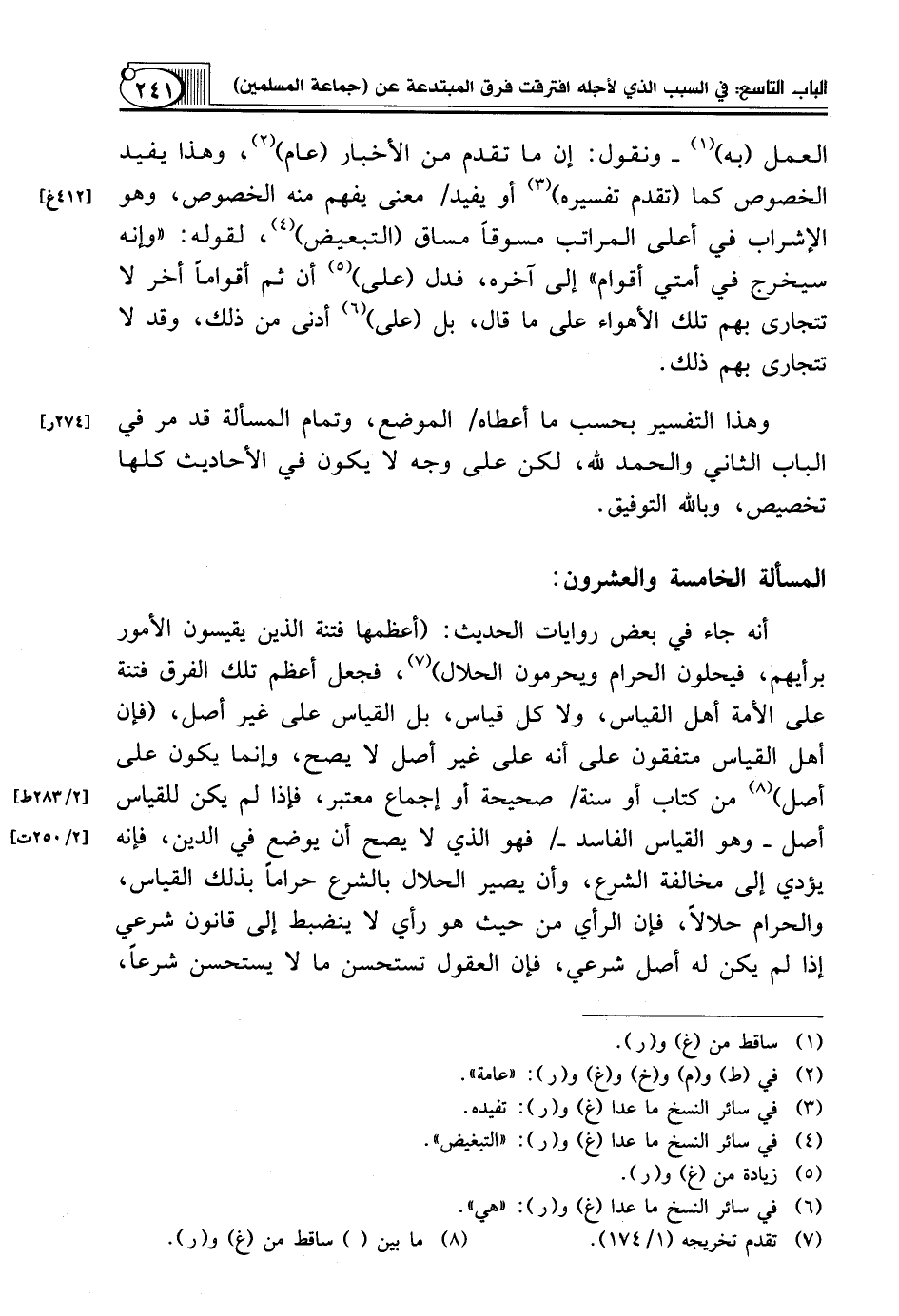 أَنَّهُ جَاءَ فِي بَعْضِ رِوَايَاتِ الْحَدِيثِ: (أَعْظَمُهَا فِتْنَةً الَّذِينَ يَقِيسُونَ الْأُمُورَ بِرَأْيِهِمْ، فَيُحِلُّونَ الْحَرَامَ وَيُحَرِّمُونَ الْحَلَالَ) (¬7)، فَجَعَلَ أَعْظَمَ تِلْكَ الْفِرَقِ فِتْنَةً عَلَى الْأُمَّةِ أَهْلَ الْقِيَاسِ، وَلَا كُلَّ قِيَاسٍ، بَلِ الْقِيَاسُ عَلَى غَيْرِ أَصْلٍ، (فَإِنَّ أَهْلَ الْقِيَاسِ مُتَّفِقُونَ عَلَى أَنَّهُ على غير أصل لا يَصِحُّ، وَإِنَّمَا يَكُونُ عَلَى أَصْلٍ) (¬8) مِنْ كِتَابٍ أَوْ سُنَّةٍ/ صَحِيحَةٍ أَوْ إِجْمَاعٍ مُعْتَبَرٍ، فَإِذَا لَمْ يَكُنْ لِلْقِيَاسِ أَصْلٌ ـ وَهُوَ الْقِيَاسُ الْفَاسِدُ ـ/ فَهُوَ الَّذِي لَا يَصِحُّ أَنْ يُوضَعَ فِي الدِّينِ، فَإِنَّهُ يُؤَدِّي إِلَى مُخَالَفَةِ الشَّرْعِ، وَأَنْ يَصِيرَ الْحَلَالُ بِالشَّرْعِ حَرَامًا بِذَلِكَ الْقِيَاسِ، وَالْحَرَامُ حَلَالًا، فَإِنَّ الرَّأْيَ مِنْ حَيْثُ هُوَ رَأْيٌ لَا يَنْضَبِطُ إِلَى قَانُونٍ شَرْعِيٍّ إِذَا لَمْ يَكُنْ لَهُ أَصْلٌ شَرْعِيٌّ، فَإِنَّ الْعُقُولَ تَسْتَحْسِنُ ما لا يستحسن شرعاً،