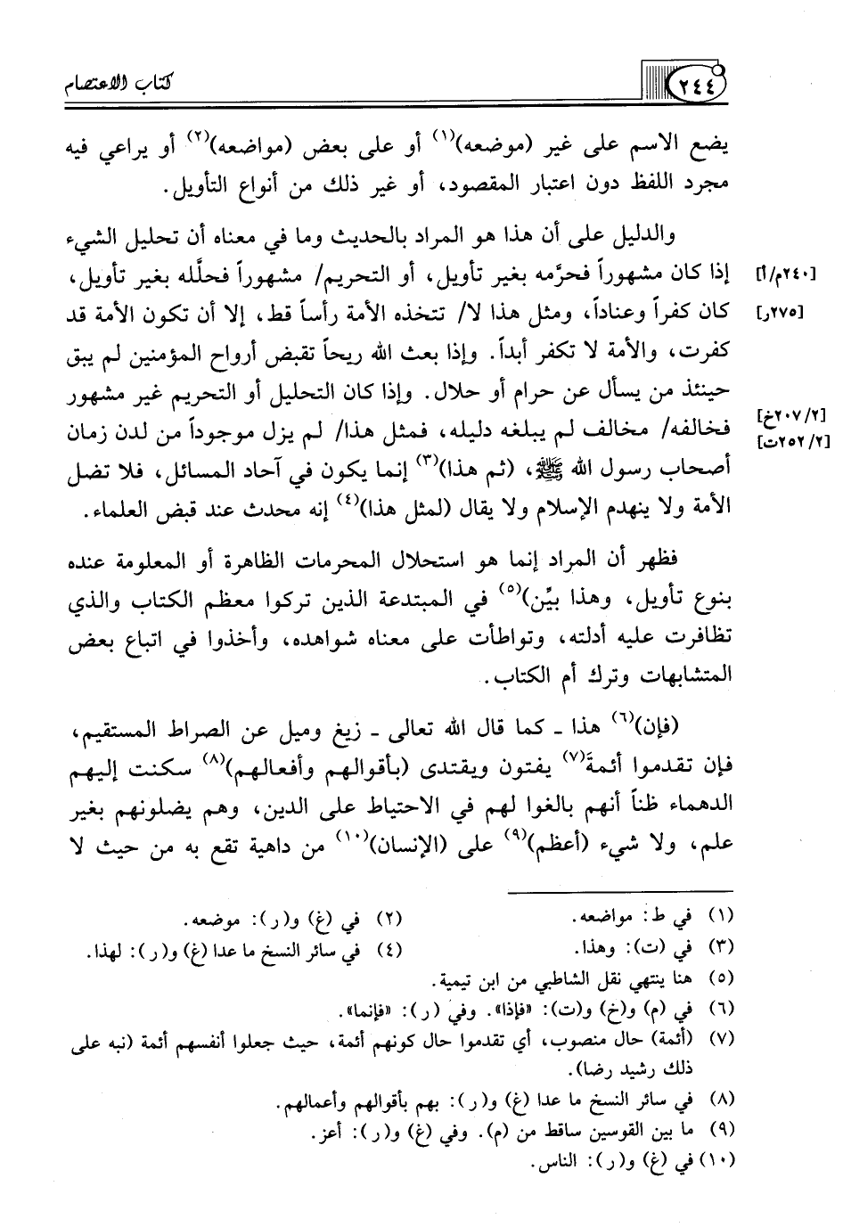 فَظَهَرَ أَنَّ الْمُرَادَ إِنَّمَا هُوَ اسْتِحْلَالُ الْمُحَرَّمَاتِ الظَّاهِرَةِ أَوِ الْمَعْلُومَةِ عِنْدَهُ بِنَوْعِ تَأْوِيلٍ، وَهَذَا بيِّن) (¬5) فِي المبتدعة الذين تركوا معظم الكتاب والذي تظافرت عَلَيْهِ أَدِلَّتُهُ، وَتَوَاطَأَتْ عَلَى مَعْنَاهُ شَوَاهِدُهُ، وَأَخَذُوا فِي اتِّبَاعِ بَعْضِ الْمُتَشَابِهَاتِ وَتَرْكِ أُمِّ الْكِتَابِ.