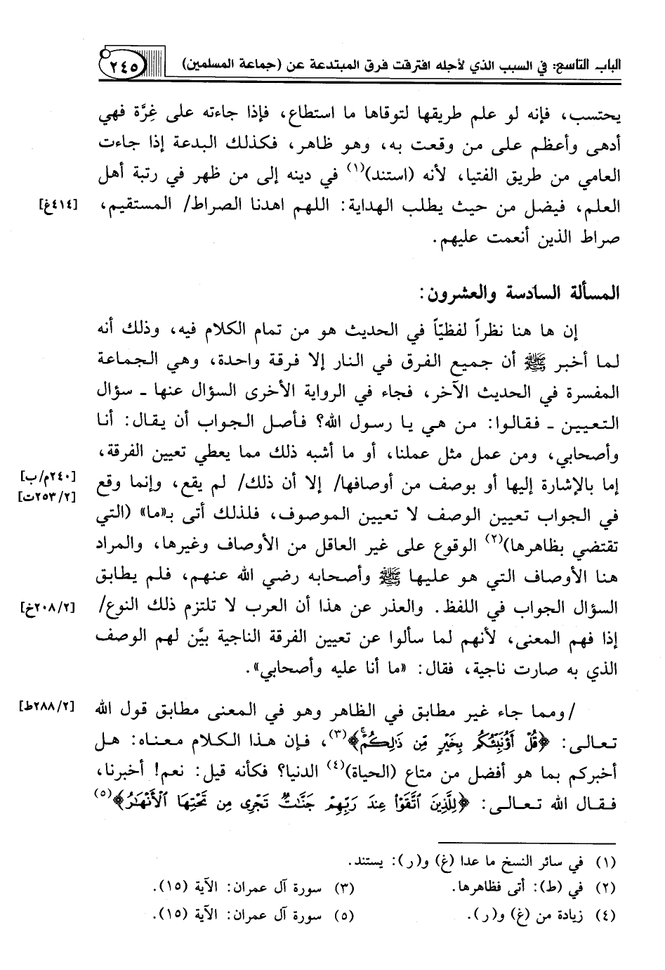 إن ها هنا نَظَرًا لَفْظِيًّا فِي الْحَدِيثِ هُوَ مِنْ تَمَامِ الكلام فيه، وذلك أنه لما أخبر صلّى الله عليه وسلّم أَنَّ جَمِيعَ الْفِرَقِ فِي النَّارِ إِلَّا فِرْقَةً وَاحِدَةً، وَهِيَ الْجَمَاعَةُ الْمُفَسِّرَةُ فِي الْحَدِيثِ الْآخَرِ، فَجَاءَ فِي الرِّوَايَةِ الْأُخْرَى السُّؤَالُ عَنْهَا ـ سُؤَالُ التَّعْيِينِ ـ فَقَالُوا: مَنْ هِيَ يَا رَسُولَ اللَّهِ؟ فَأَصْلُ الْجَوَابِ أَنْ يُقَالَ: أَنَا وَأَصْحَابِي، وَمَنْ عَمِلَ مِثْلَ عَمَلِنَا، أَوْ مَا أَشْبَهَ ذَلِكَ مما يعطي تعيين الفرقة، إما بالإشارة إليها أَوْ بِوَصْفٍ مِنْ أَوْصَافِهَا/ إِلَّا أَنَّ ذَلِكَ/ لَمْ يَقَعْ، وَإِنَّمَا وَقَعَ فِي الْجَوَابِ تَعْيِينُ الوصف لا تعيين الموصوف، فلذلك أتى بـ"ما" (التي تقتضي بظاهرها) (¬2) الْوُقُوعُ عَلَى غَيْرِ الْعَاقِلِ مِنَ الْأَوْصَافِ وَغَيْرِهَا، وَالْمُرَادُ هُنَا الْأَوْصَافُ الَّتِي هُوَ عَلَيْهَا صَلَّى اللَّهُ عَلَيْهِ وَسَلَّمَ وَأَصْحَابُهُ رَضِيَ اللَّهُ عَنْهُمْ، فَلَمْ يُطَابِقِ السُّؤَالُ الْجَوَابَ فِي اللَّفْظِ. وَالْعُذْرُ عَنْ هَذَا أَنَّ الْعَرَبَ لَا تَلْتَزِمُ ذَلِكَ النَّوْعَ/ إِذَا فُهِمَ الْمَعْنَى، لِأَنَّهُمْ لَمَّا سَأَلُوا عَنْ تَعْيِينِ الْفِرْقَةِ النَّاجِيَةِ بيَّن لَهُمُ الْوَصْفَ الَّذِي بِهِ صَارَتْ نَاجِيَةً، فَقَالَ: "مَا أَنَا عَلَيْهِ وَأَصْحَابِي".